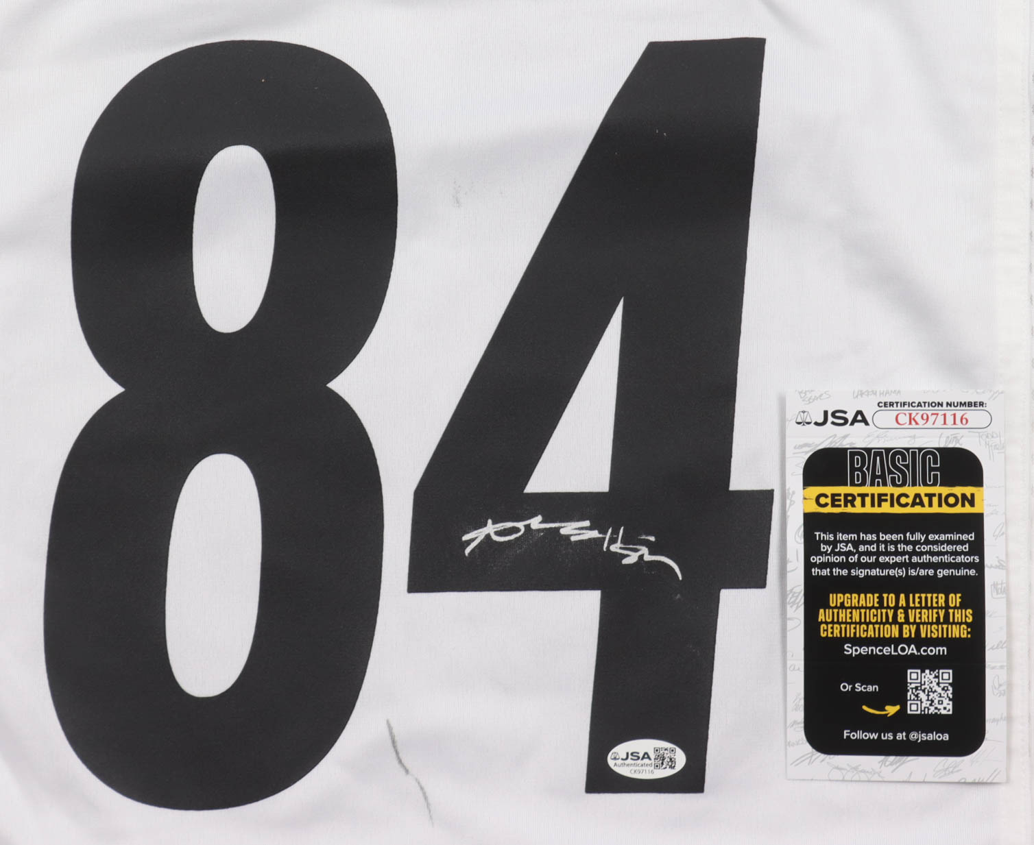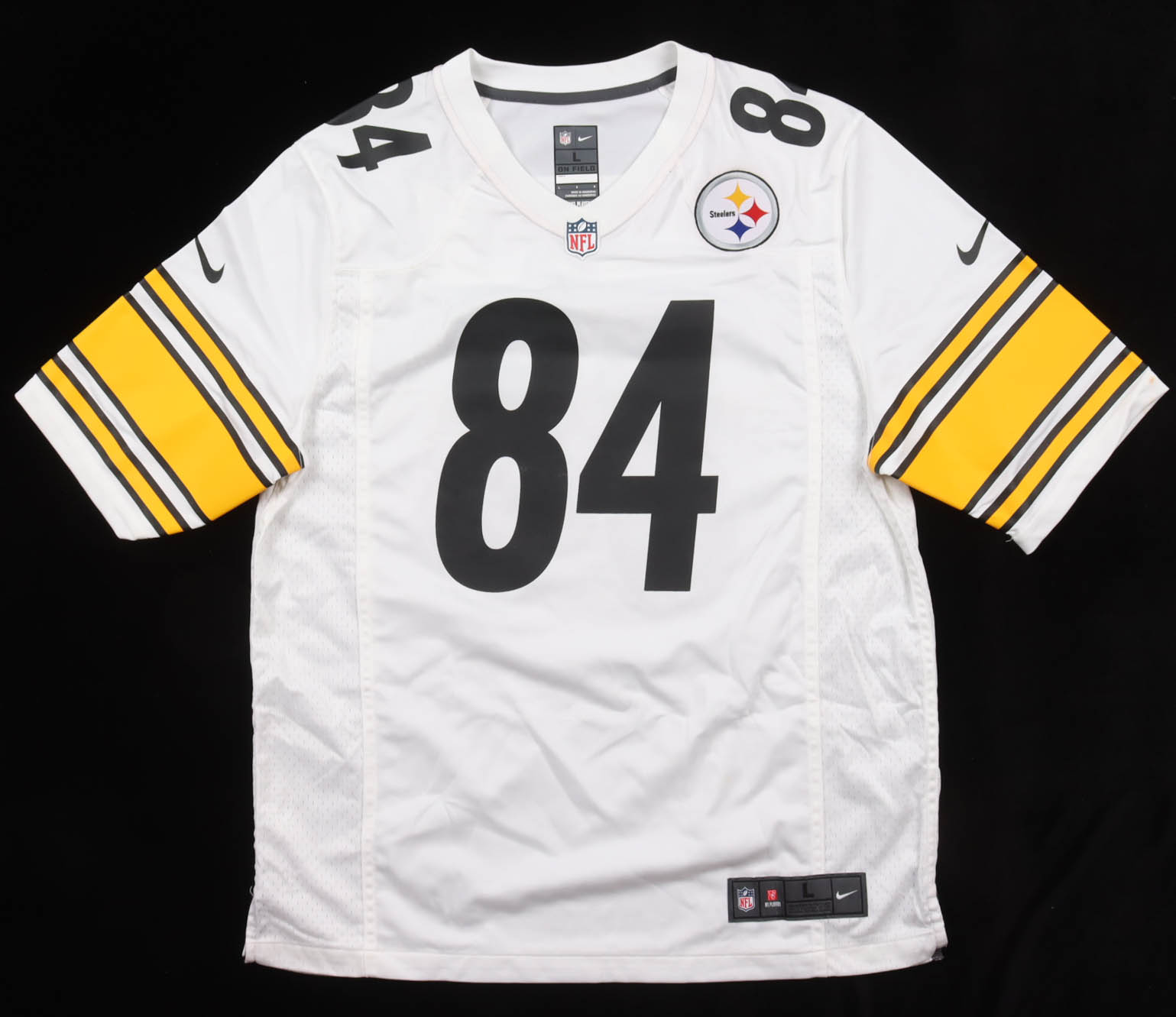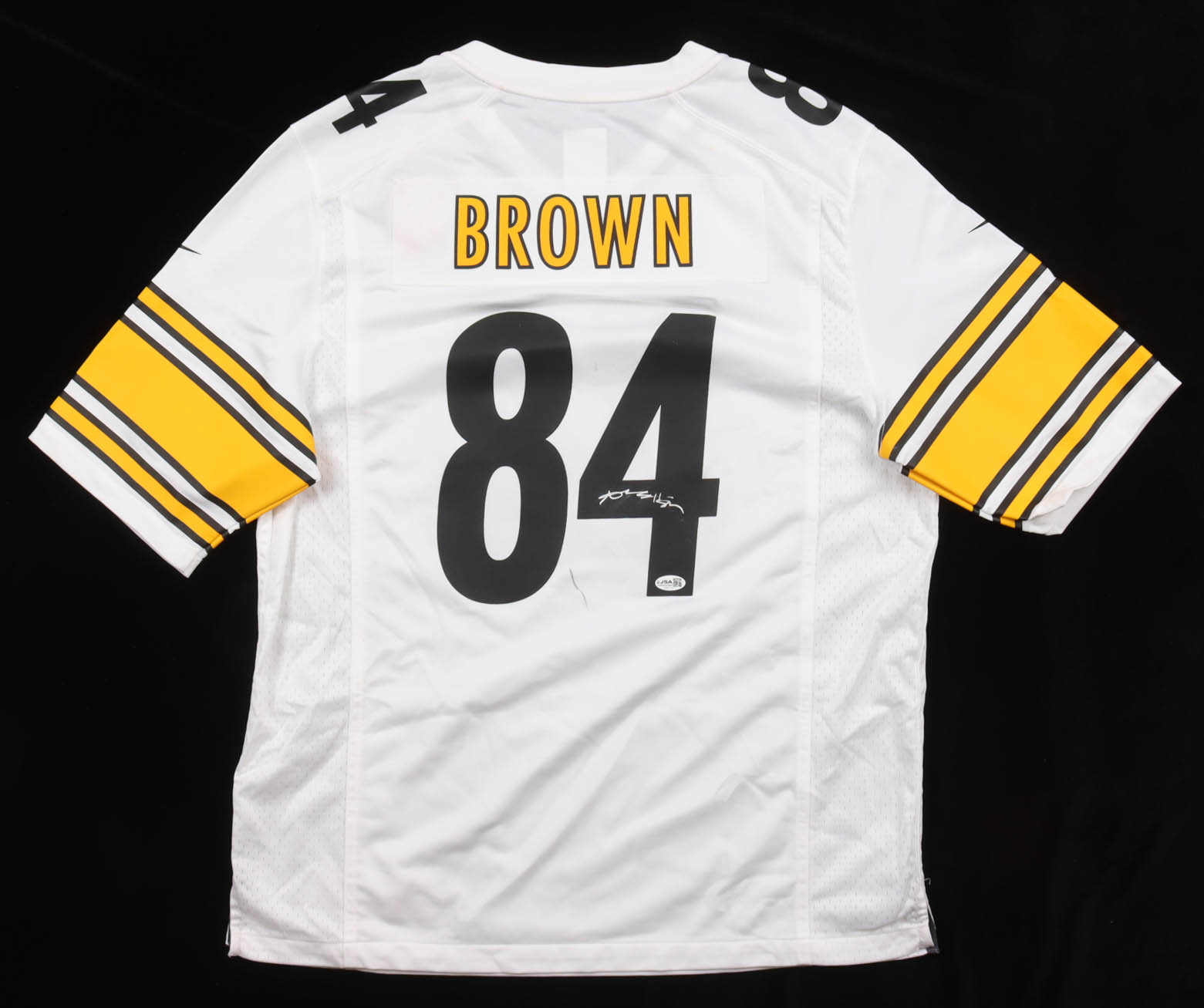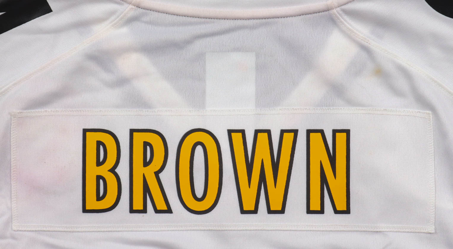 Nike authentic jersey with everything pressed on, size L. Hand-signed by Antonio Brown. Please note, there are multiple stains surrounding the reverse numbers.