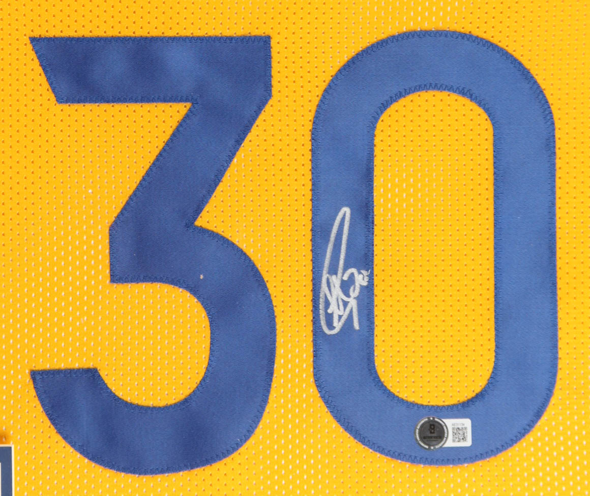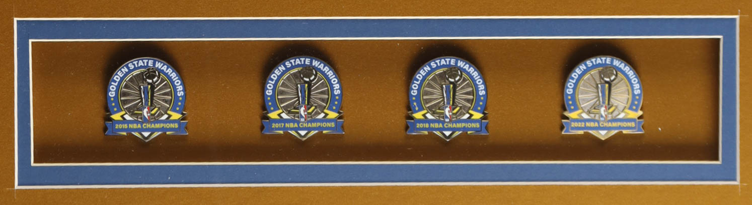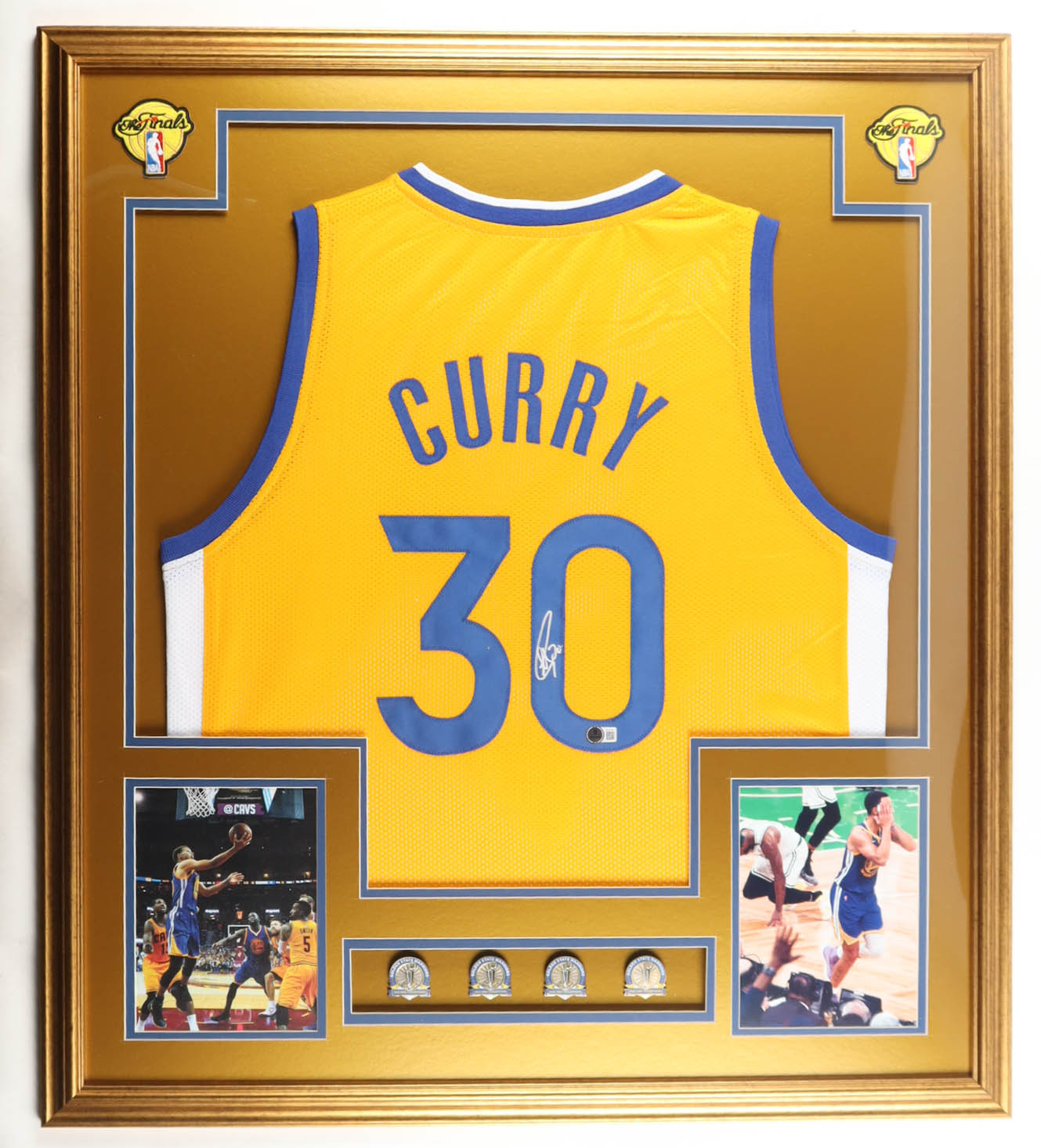 Stephen Curry Signed Custom Framed Jersey Display with (4) NBA Finals Champions Pins (Beckett)