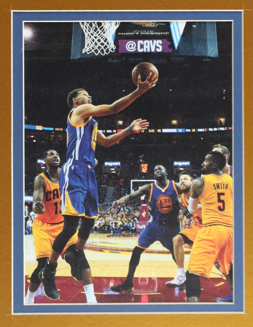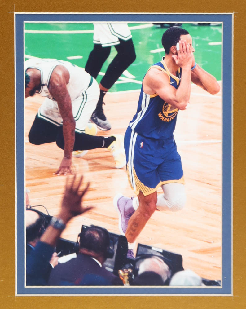 Custom frame measures 35" x 43" in size and features a jersey hand-signed by Stephen Curry. Please note that the 8" x 10" photos may be in reverse order. Display also features (4) NBA Finals Champions pins and (2) NBA Finals cloth patches. Please see photos for details regarding the condition of the item.