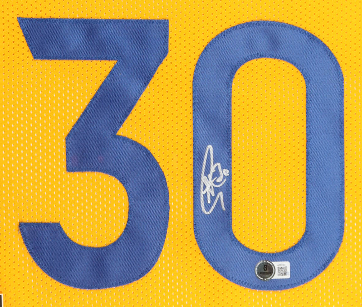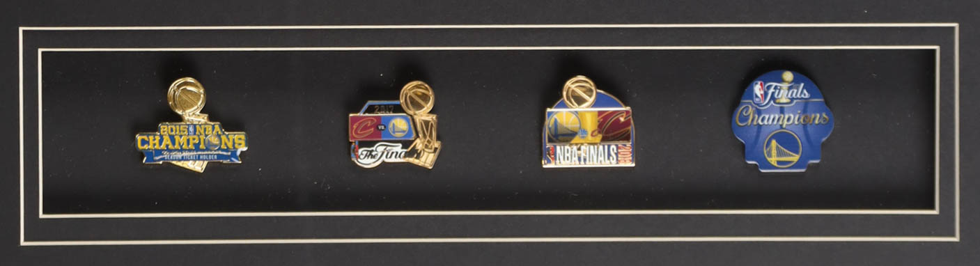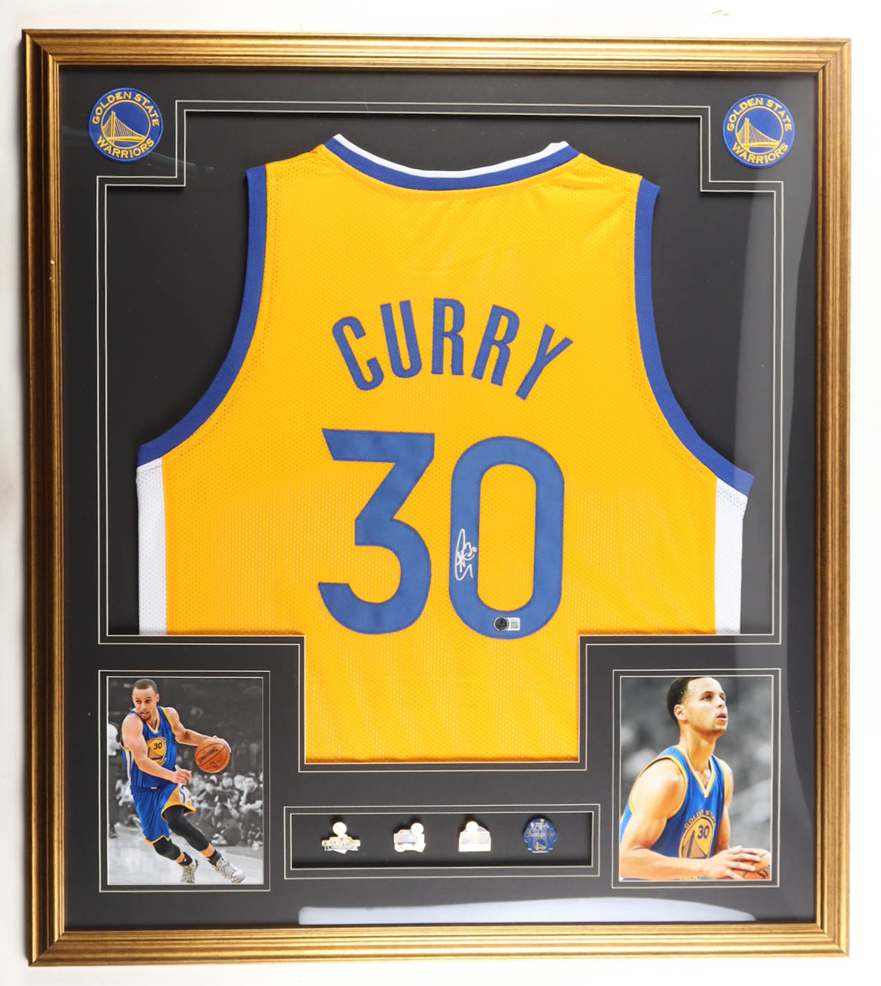 Stephen Curry Signed Custom Framed Jersey Display with (4) NBA Finals Champions Pins (Beckett)