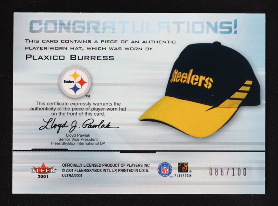 Plaxico Burress 2001 Ultra Head of the Class Player Worn Caps #15 #086/100 RC