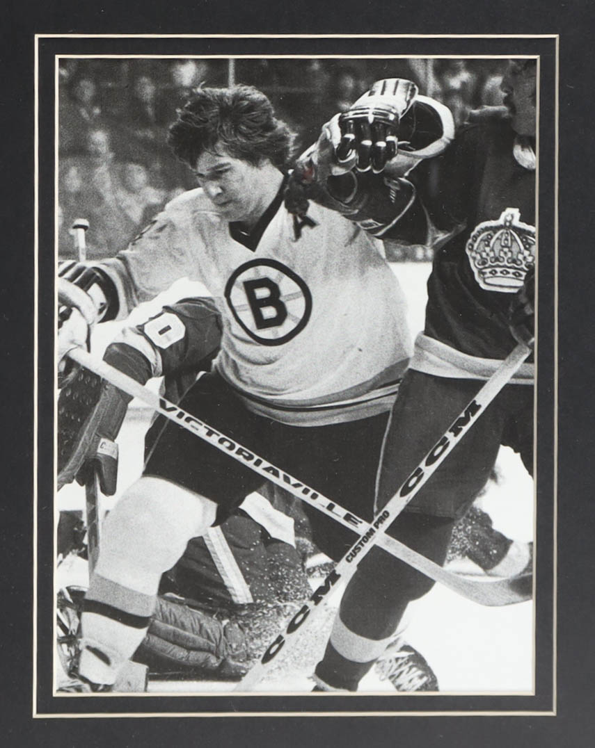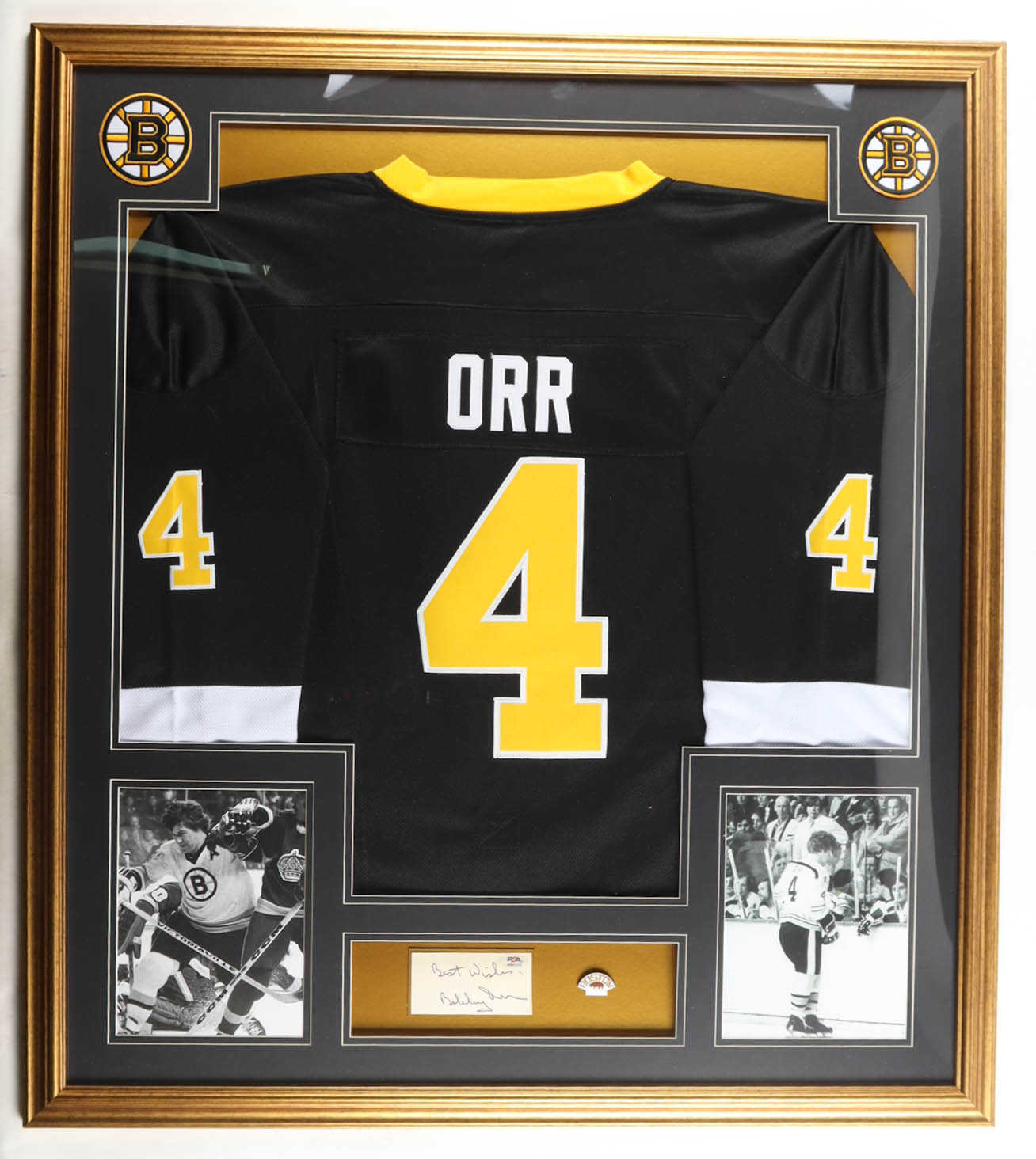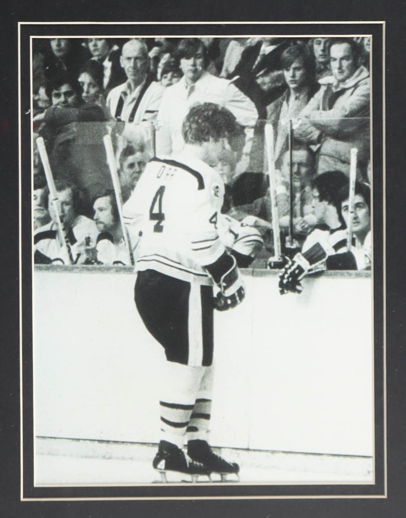 Custom frame measures 35" x 43" in size and features a cut that has been hand-signed and inscribed by Bobby Orr (HOF). Please note that the 8" x 10" photos may be in reverse order. Display also features a jersey and a Boston Bruins logo pin. Please see photos for details regarding the condition of the item.
