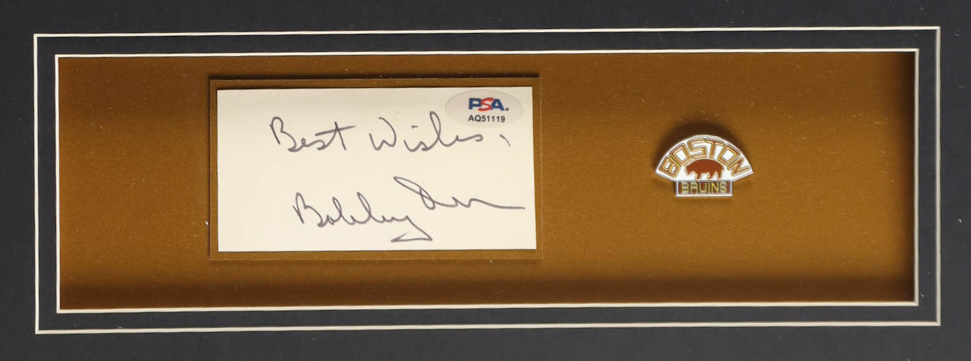 Bobby Orr Signed Custom Framed Cut Display Inscribed "Best Wishes" with Jersey & Bruins Logo Pin (PSA)