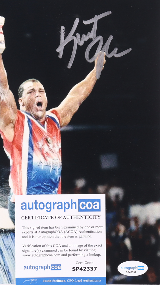 Photo measures 8" x 10" in size. Hand-signed by Kurt Angle (HOF).