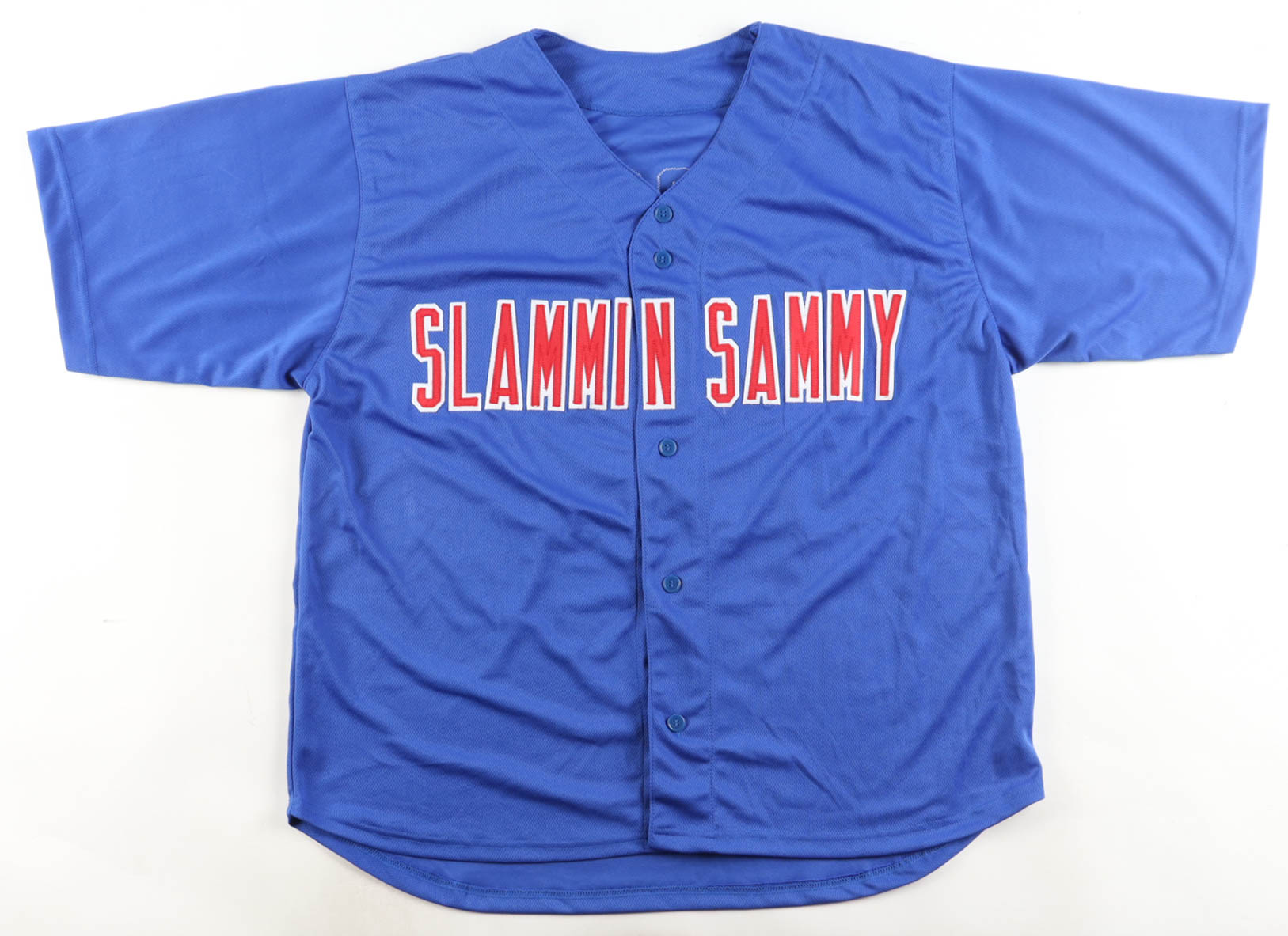 Custom jersey with everything sewn on, size XL. Hand-signed by Sammy Sosa (Chicago Cubs).