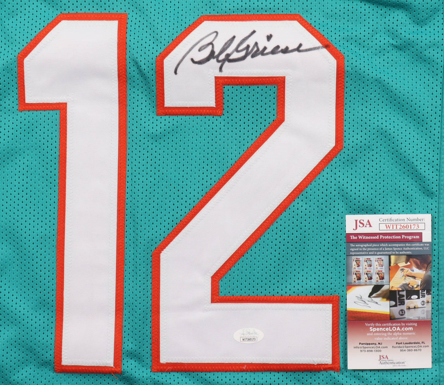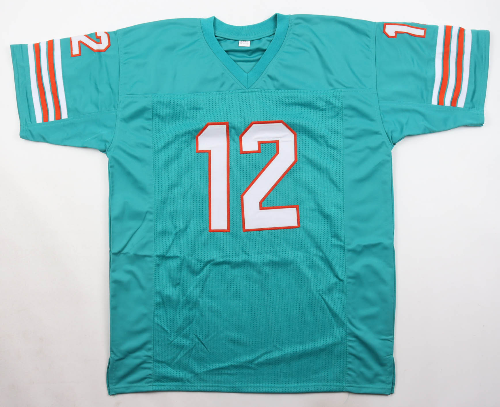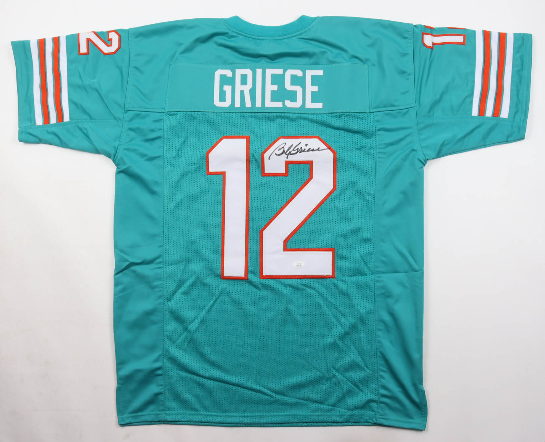 Custom jersey with everything sewn on, size XL. Hand-signed by Bob Griese (Miami Dolphins, HOF).