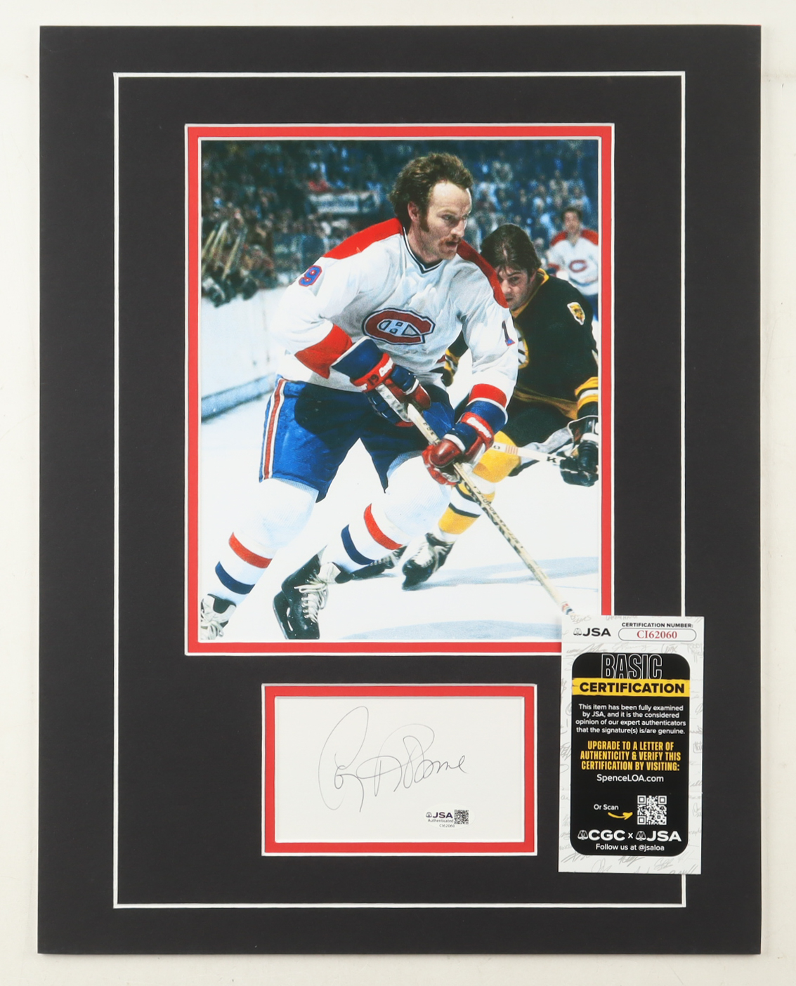 Custom display measures approximately 14" x 18" in size and features a cut that has been hand-signed by Larry Robinson (Montreal Canadiens, HOF). The display also features a 8" x 10" photo.