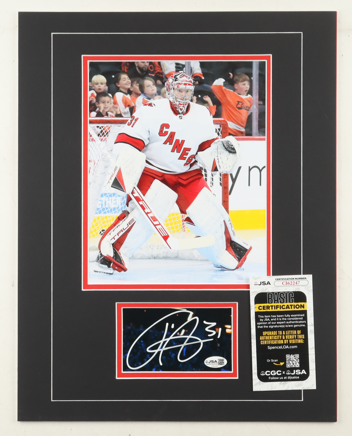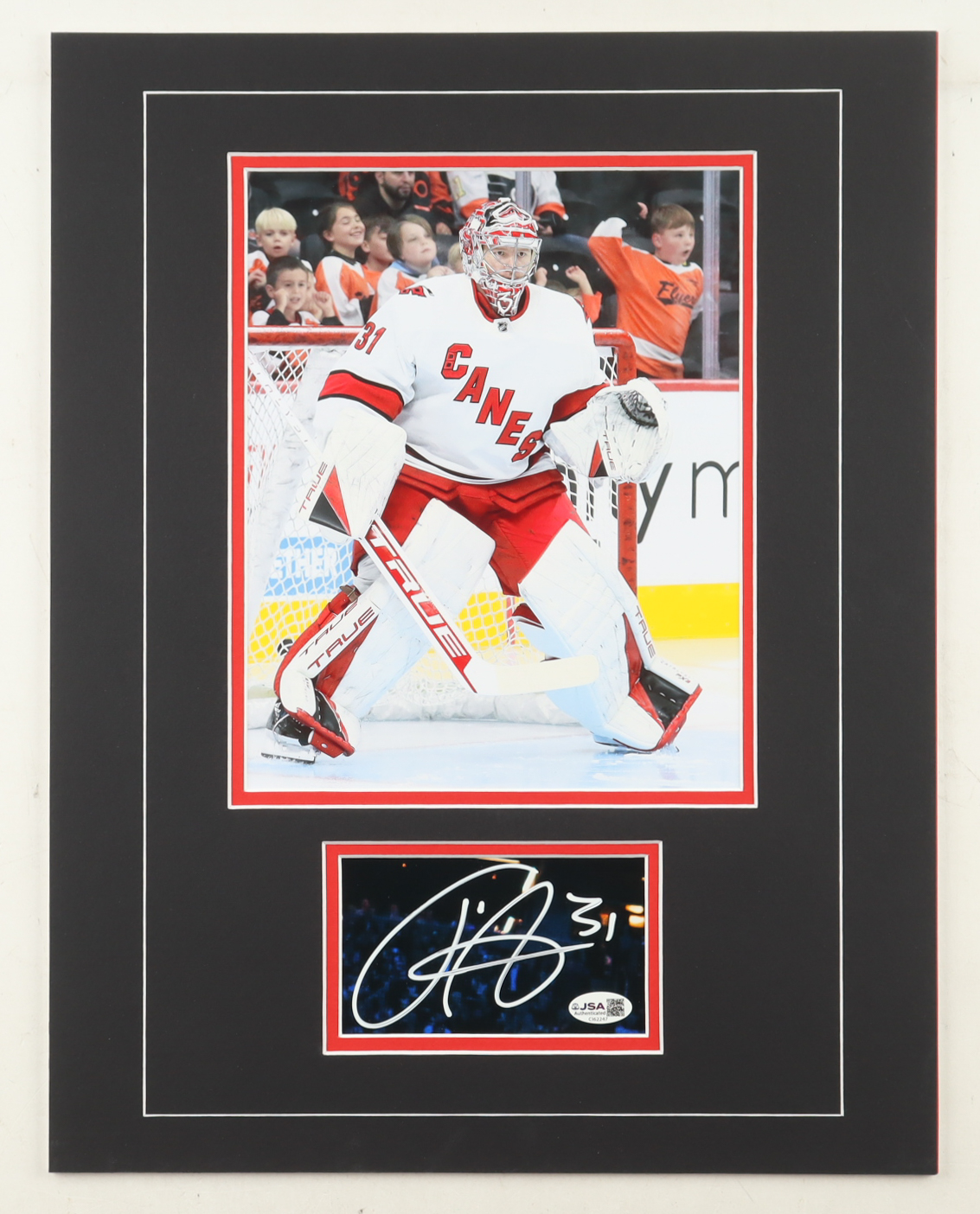Custom display measures approximately 14" x 18" in size and features a cut that has been hand-signed by Frederik Andersen (Carolina Hurricanes). The display also features a 8" x 10" photo.