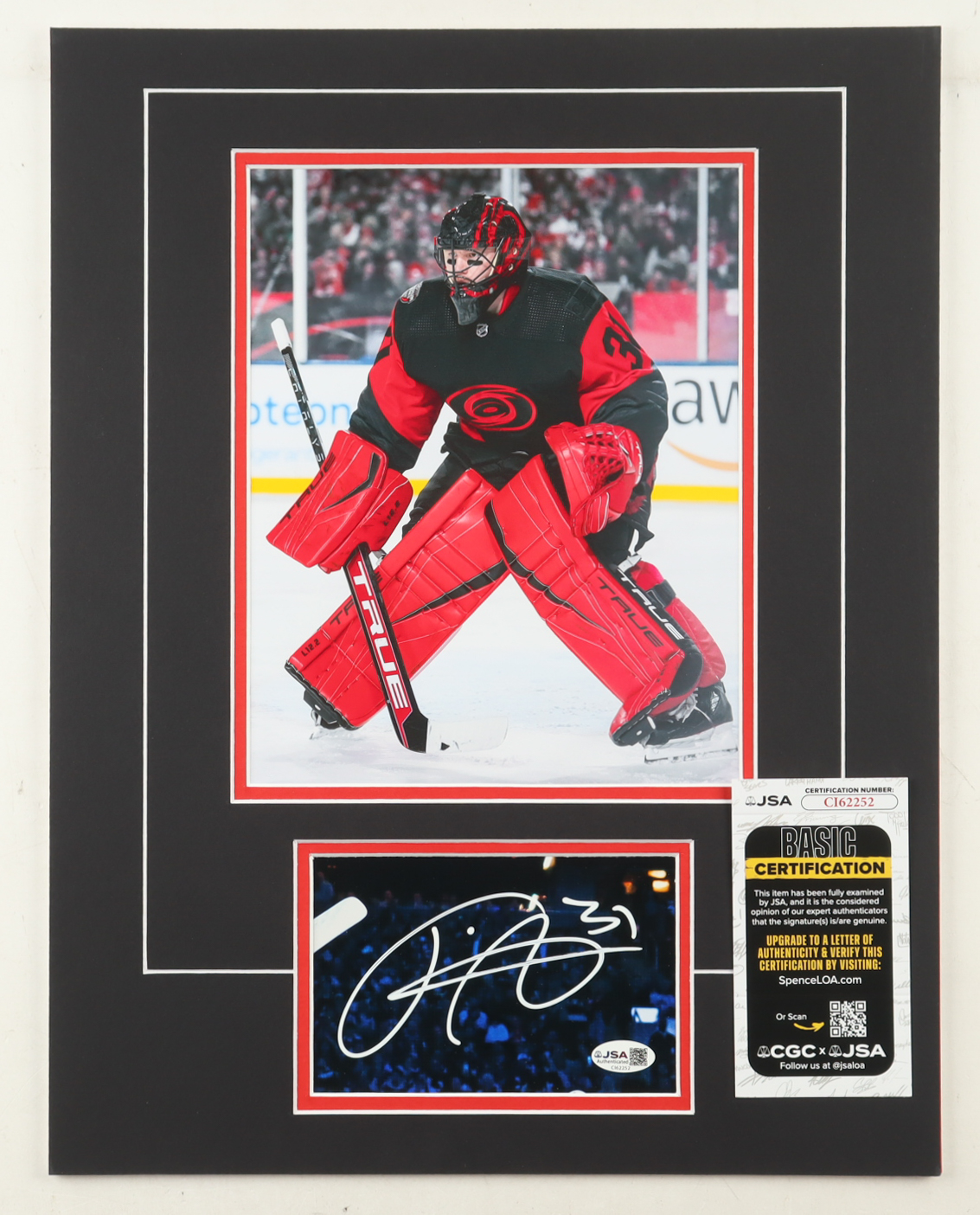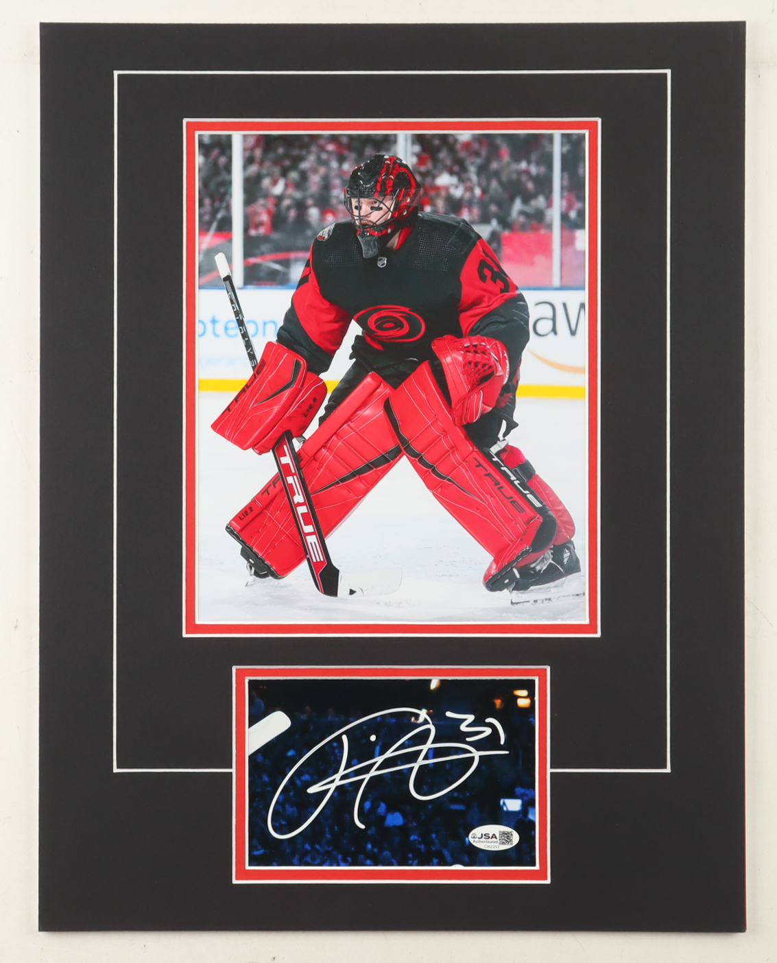 Custom display measures approximately 14" x 18" in size and features a cut that has been hand-signed by Frederik Andersen (Carolina Hurricanes). The display also features a 8" x 10" photo.