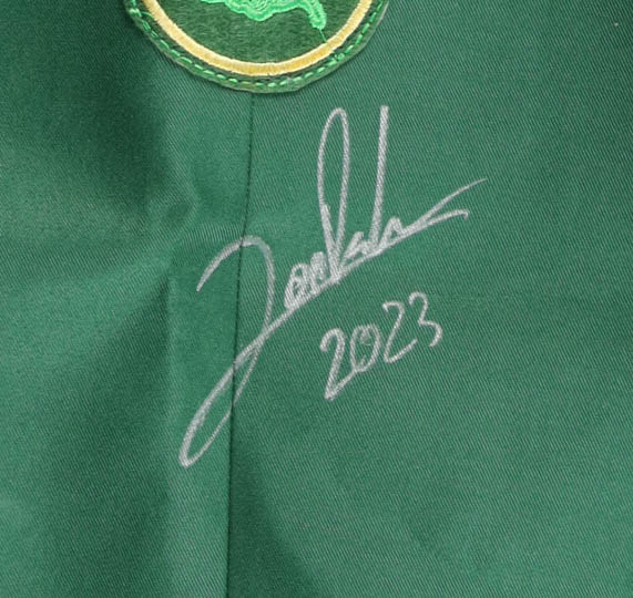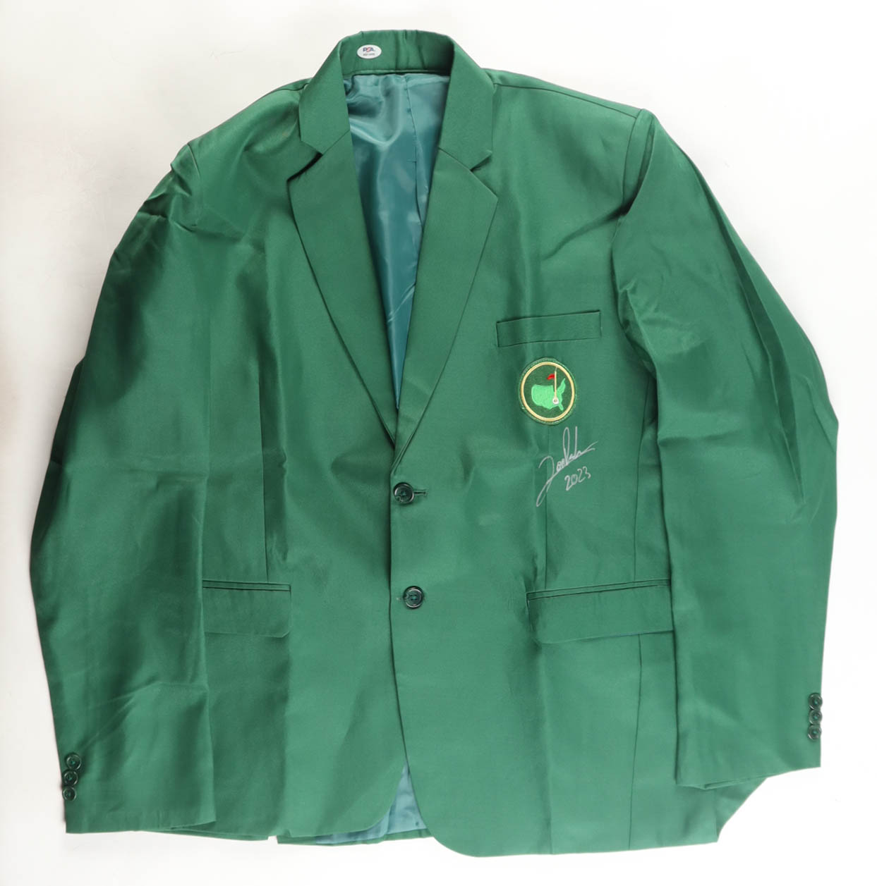Custom Masters logo sport coat with everything sewn on, size XL. Hand-signed and inscribed by Jon Rahm.