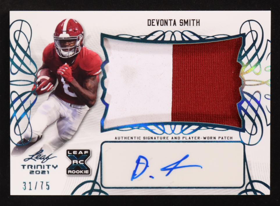 DeVonta Smith 2021 Leaf Trinity Patch Autographs Platinum Spectrum Player-Worn #PADS2 #31/75 RC
