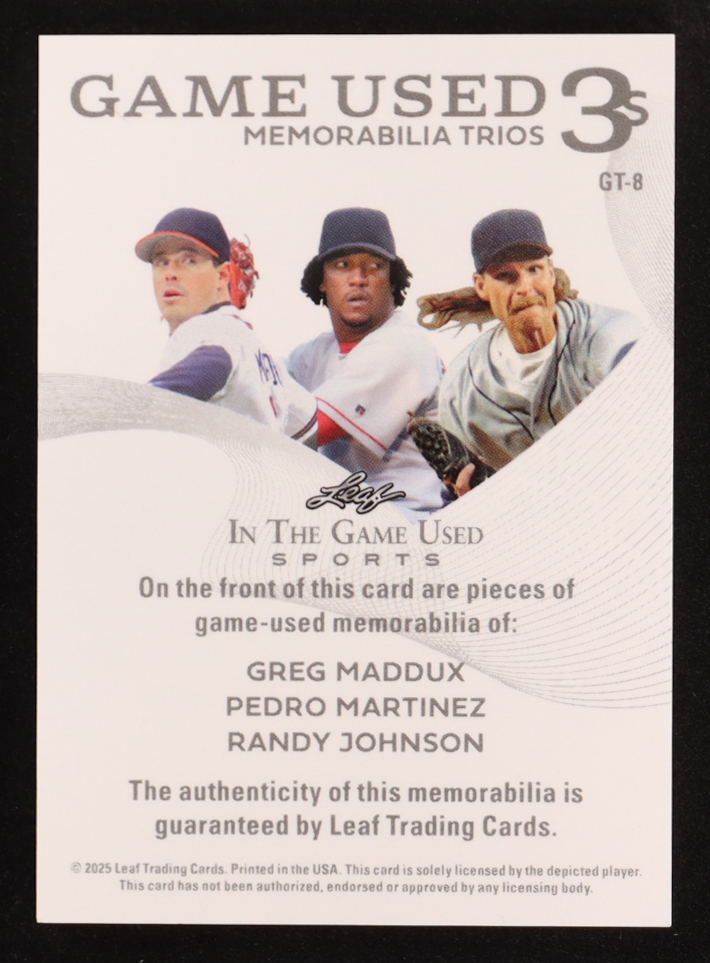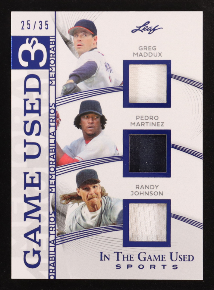 Greg Maddux / Pedro Martinez / Randy Johnson 2025 Leaf in the Game Used Trios 3's Blue Triple Relic Game-Used #GT8 #25/35