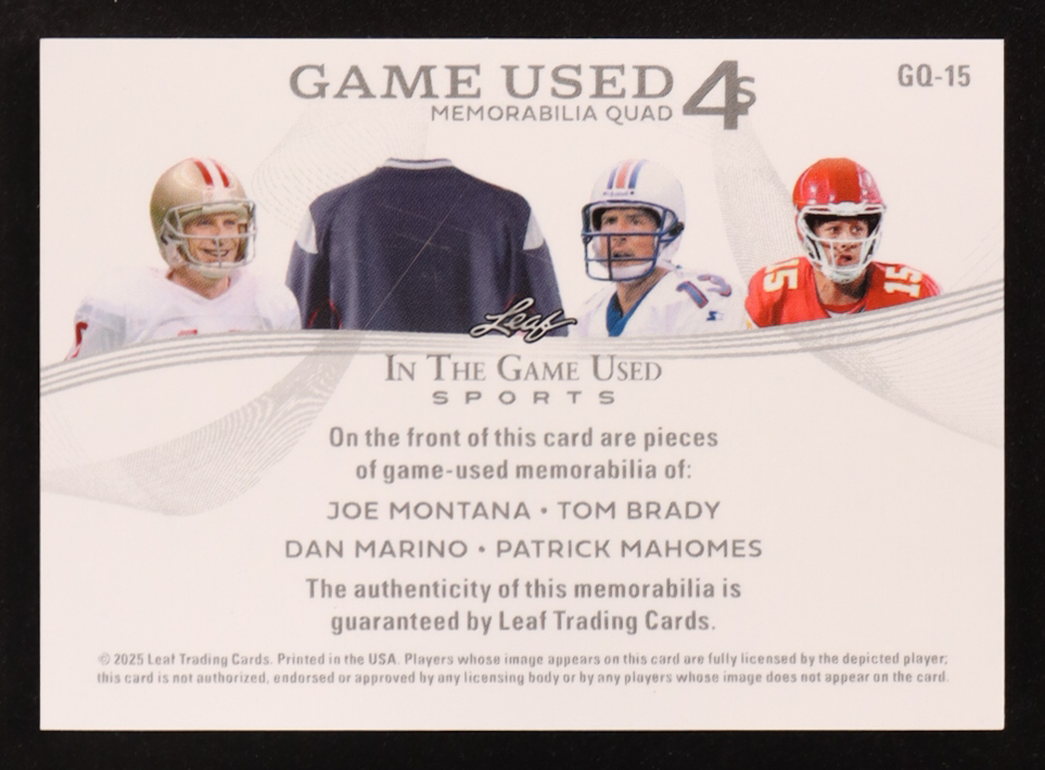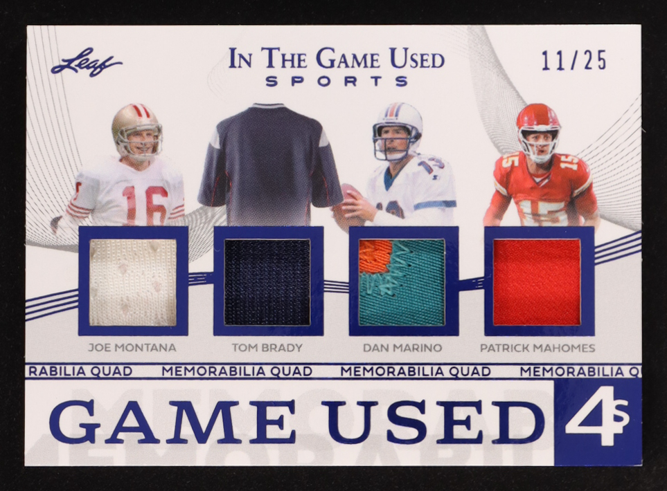 Joe Montana / Tom Brady / Dan Marino / Patrick Mahomes II 2025 Leaf in the Game Used Quad Patch Blue Game-Used #GQ15 #11/25