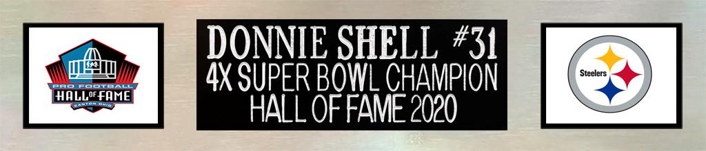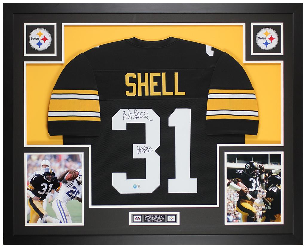 Custom frame measures 35" x 43" in size and features a jersey that has been hand-signed and inscribed by Donnie Shell (HOF).