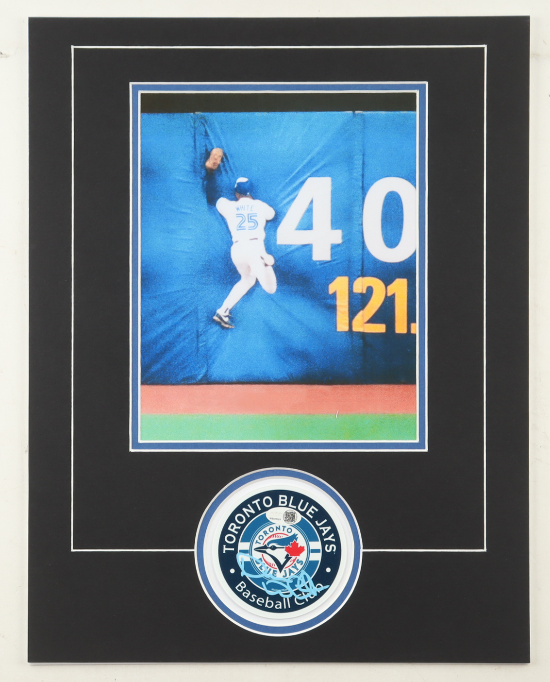 Custom display measures approximately 14" x 18" in size and features a coaster that has been hand-signed by Devon White (Toronto Blue Jays). The display also features a 8" x 10" photo.