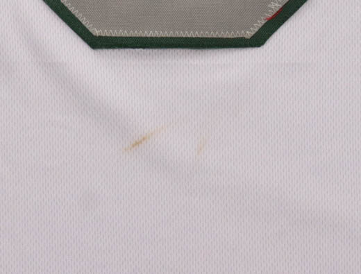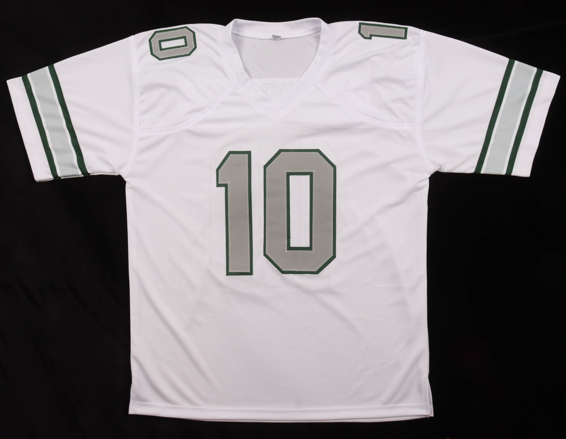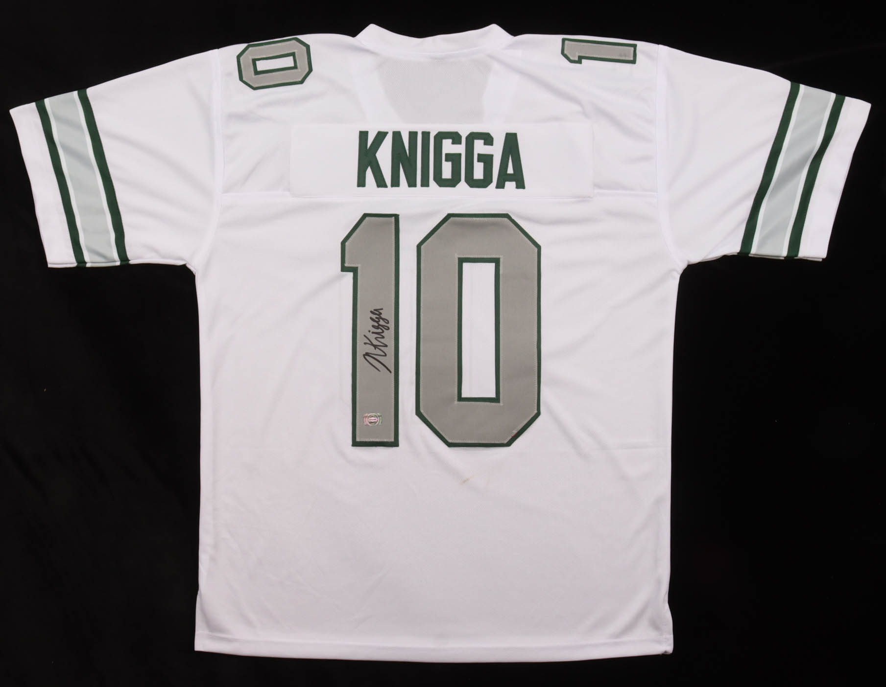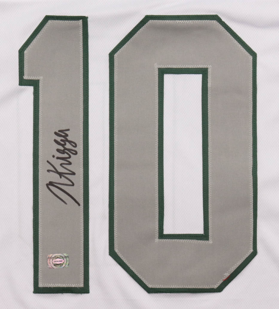 Custom jersey with everything sewn on, size XL. Hand-signed by Noah Knigga. Please note, there is staining below the reverse number and near the name plate.