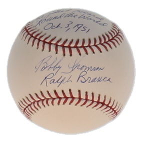 Rawlings Official National League Baseball. Hand-signed by Ralph Branca (D. 2016, Brooklyn Dodgers) and Bobby Thomson (San Francisco Giants). Please note, the baseball is naturally toned and stained.