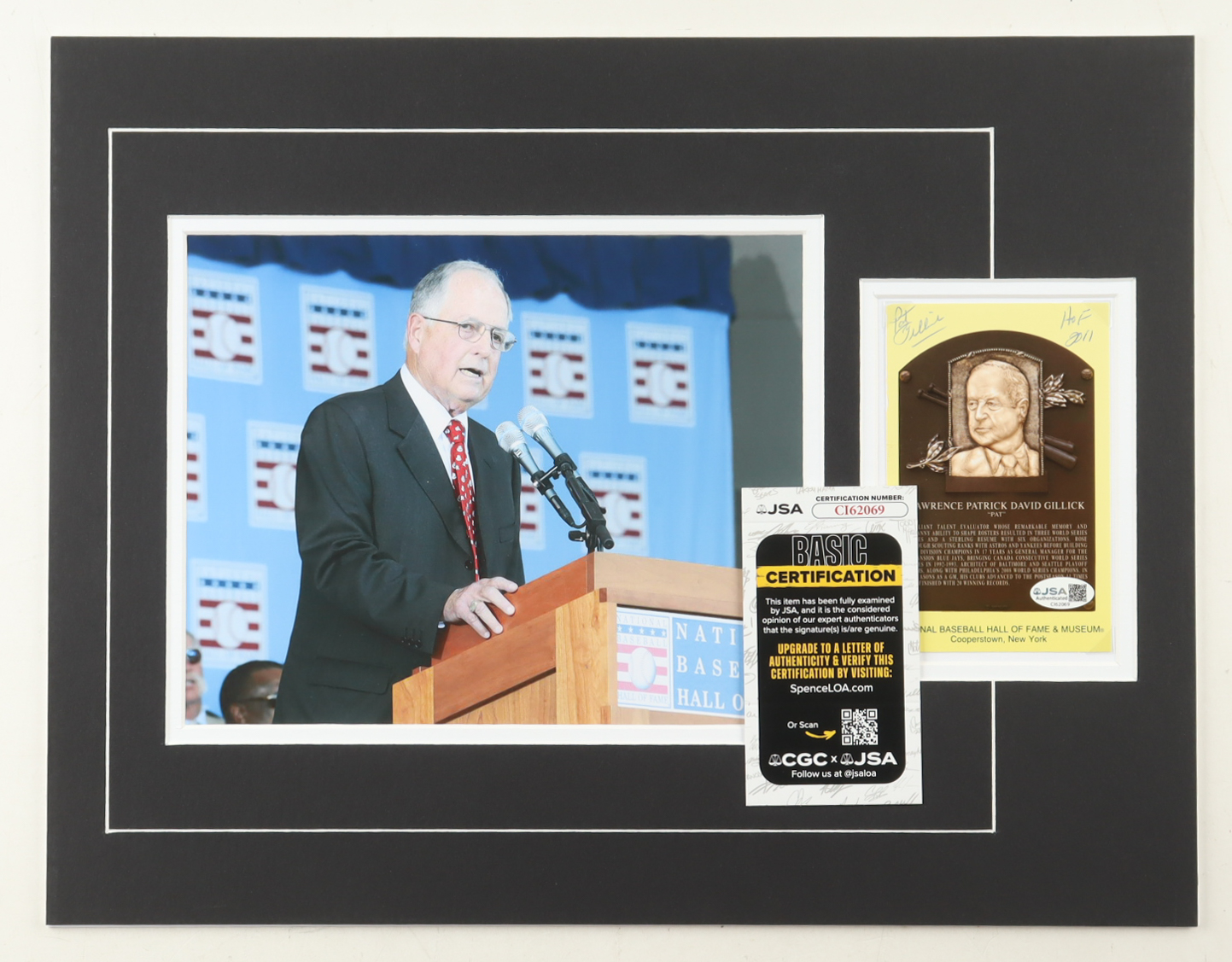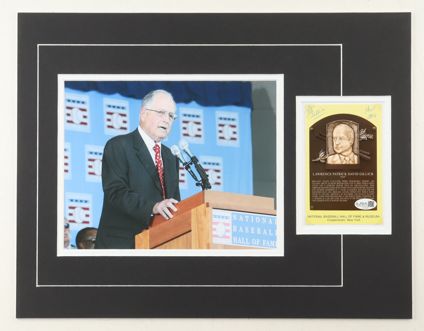 Pat Gillick Signed 14x18 Custom Matted Postcard Display with Photo Inscribed "HOF 2011" (JSA)