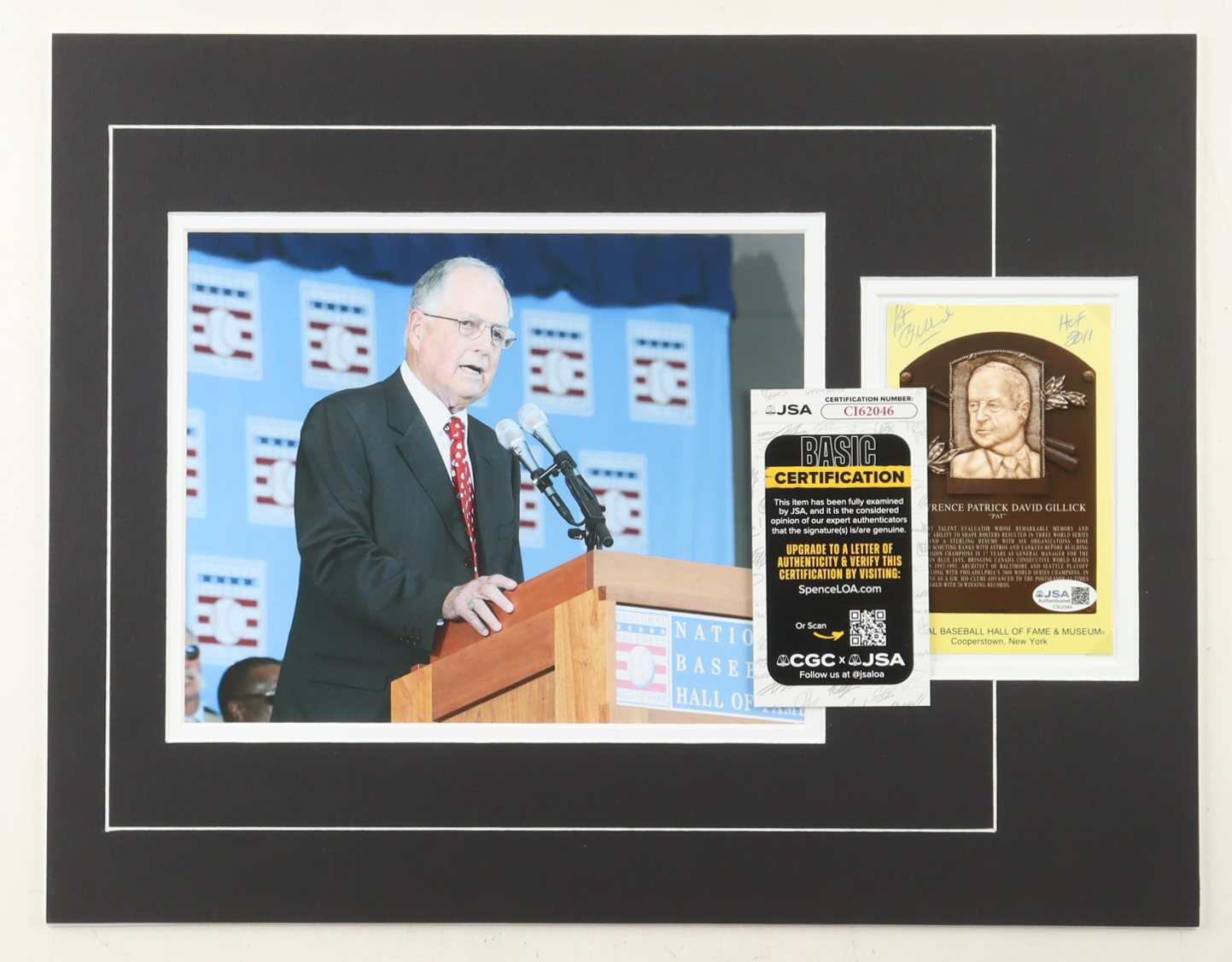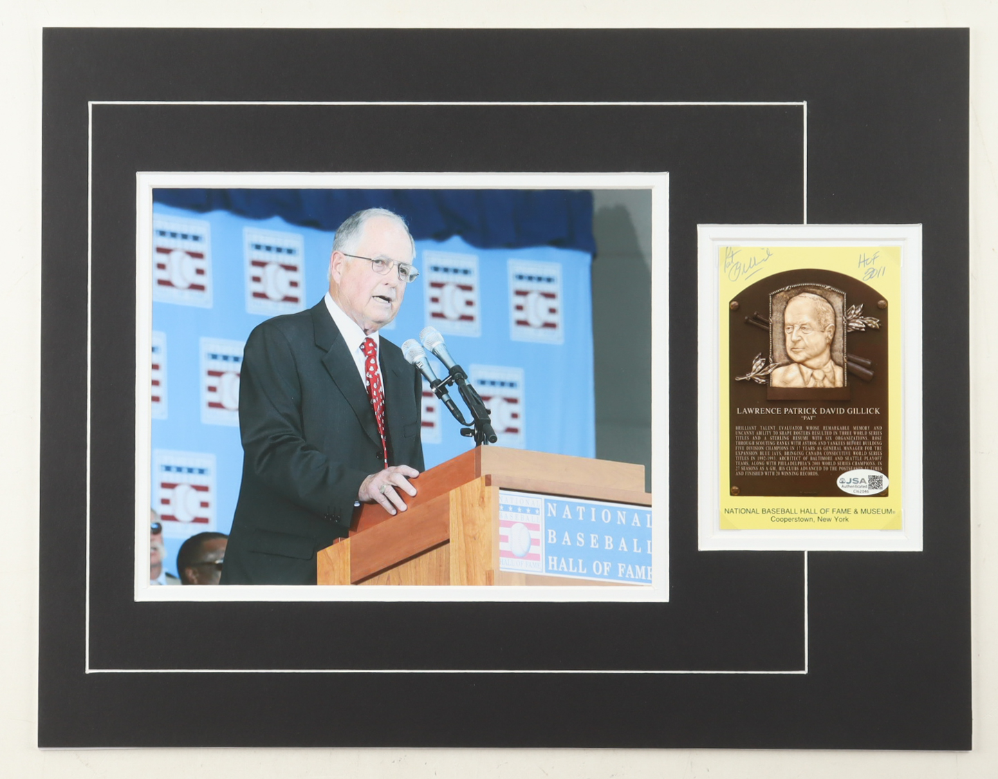 Pat Gillick Signed 14x18 Custom Matted Postcard Display with Photo Inscribed "HOF 2011" (JSA)