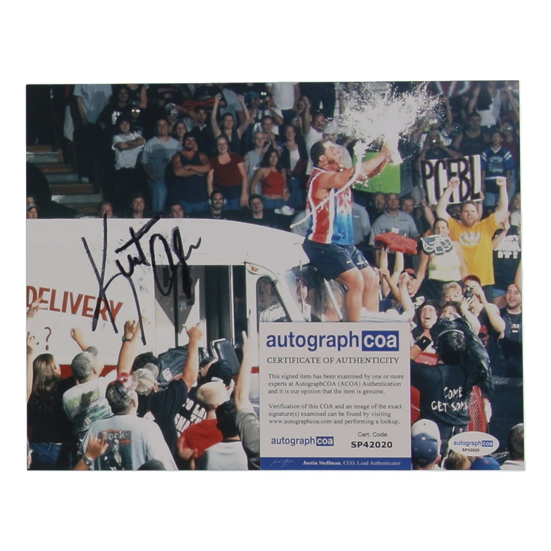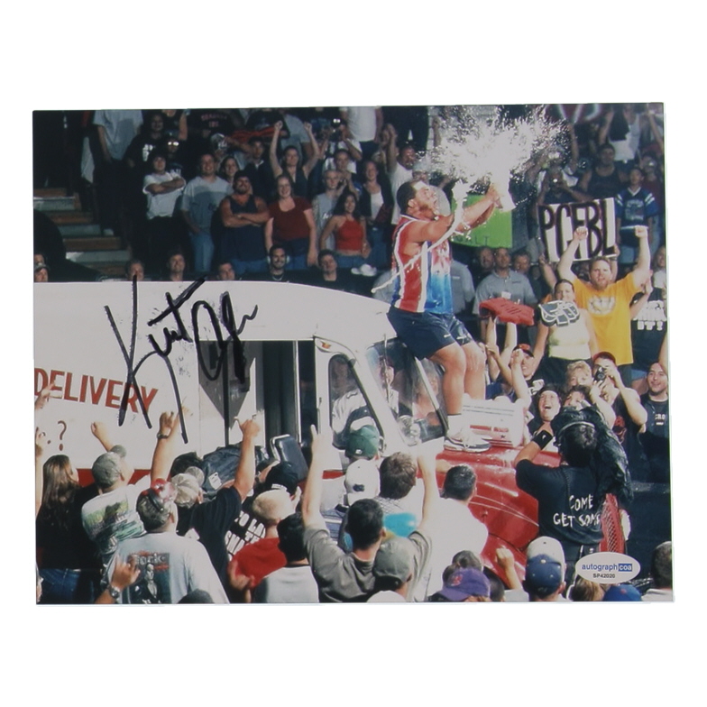 Photo measures 8" x 10" in size and has been hand-signed by Kurt Angle (HOF). Please note the signature is smudged.