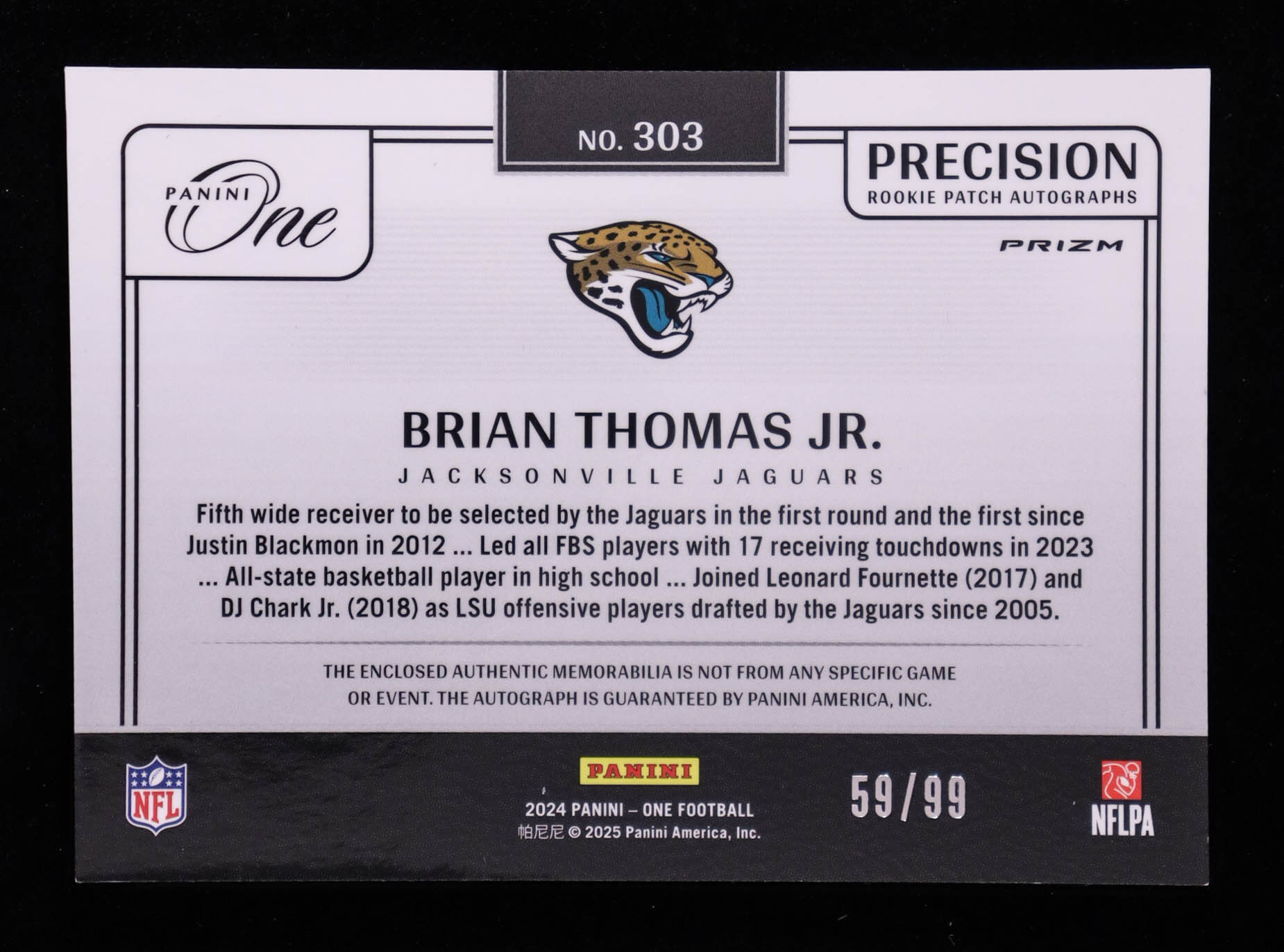Brian Thomas Jr. 2024 Panini One Precision Rookie Patch Autographs #303 RC #59/99