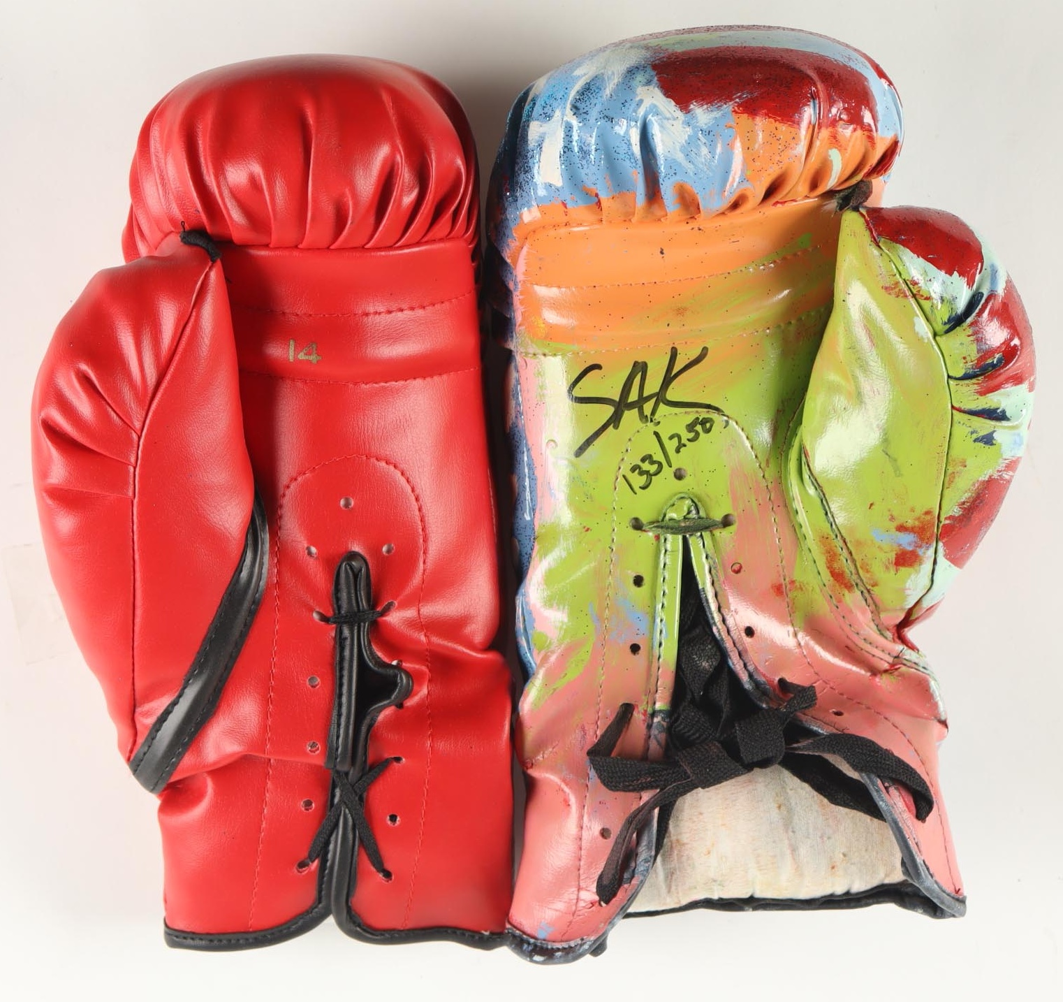 Custom painted Everlast boxing gloves has been hand-signed by boxing legend, Muhammad Ali! Also hand-signed by the artist, Steve Kaufman SAK. Limited edition #133/250.