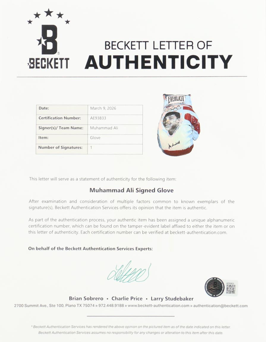 The boxing glove includes an official Beckett Authentication Services hologram and matching LOA for authenticity purposes.