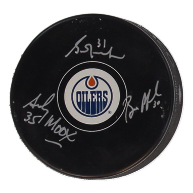 Grant Fuhr, Andy Moog & Bill Ranford Signed Oilers Logo Hockey Puck (COJO)