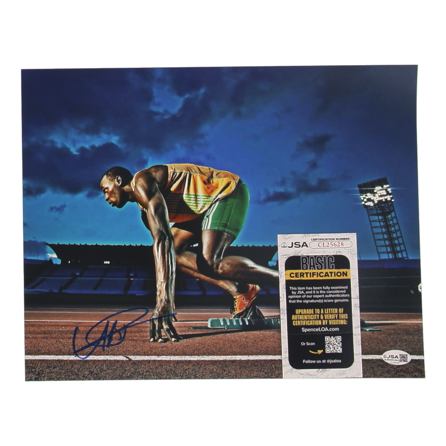 Photograph measures 11" x 14" in size. Hand-signed by Usain Bolt.