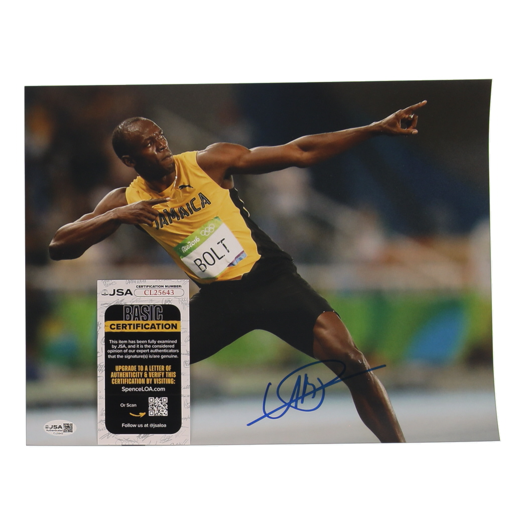 Photograph measures 11" x 14" in size. Hand-signed by Usain Bolt.