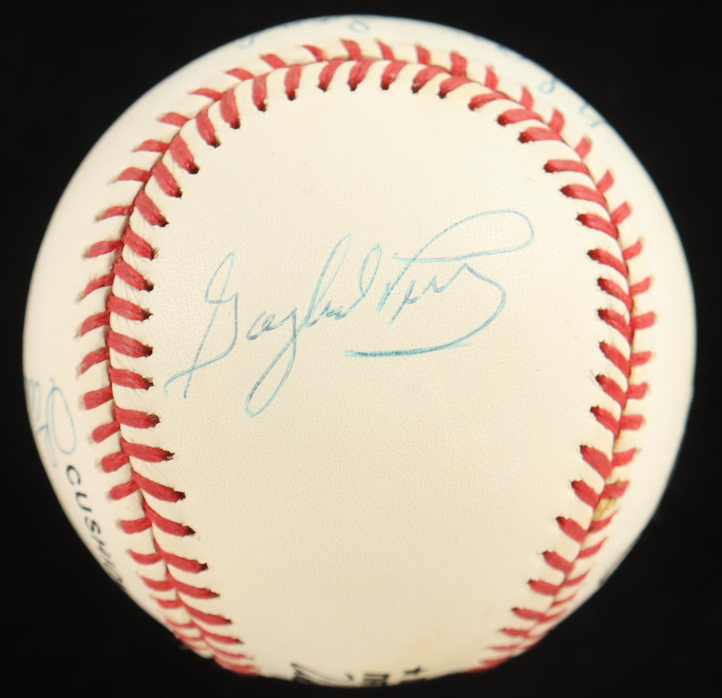 Rawlings Official National League Baseball. Hand-signed by (6) players in the 300 win club. Signers include Tom Seaver, Phil Niekro, Steve Carlton, Warren Spahn, Early Wynn, and Gaylord Perry.