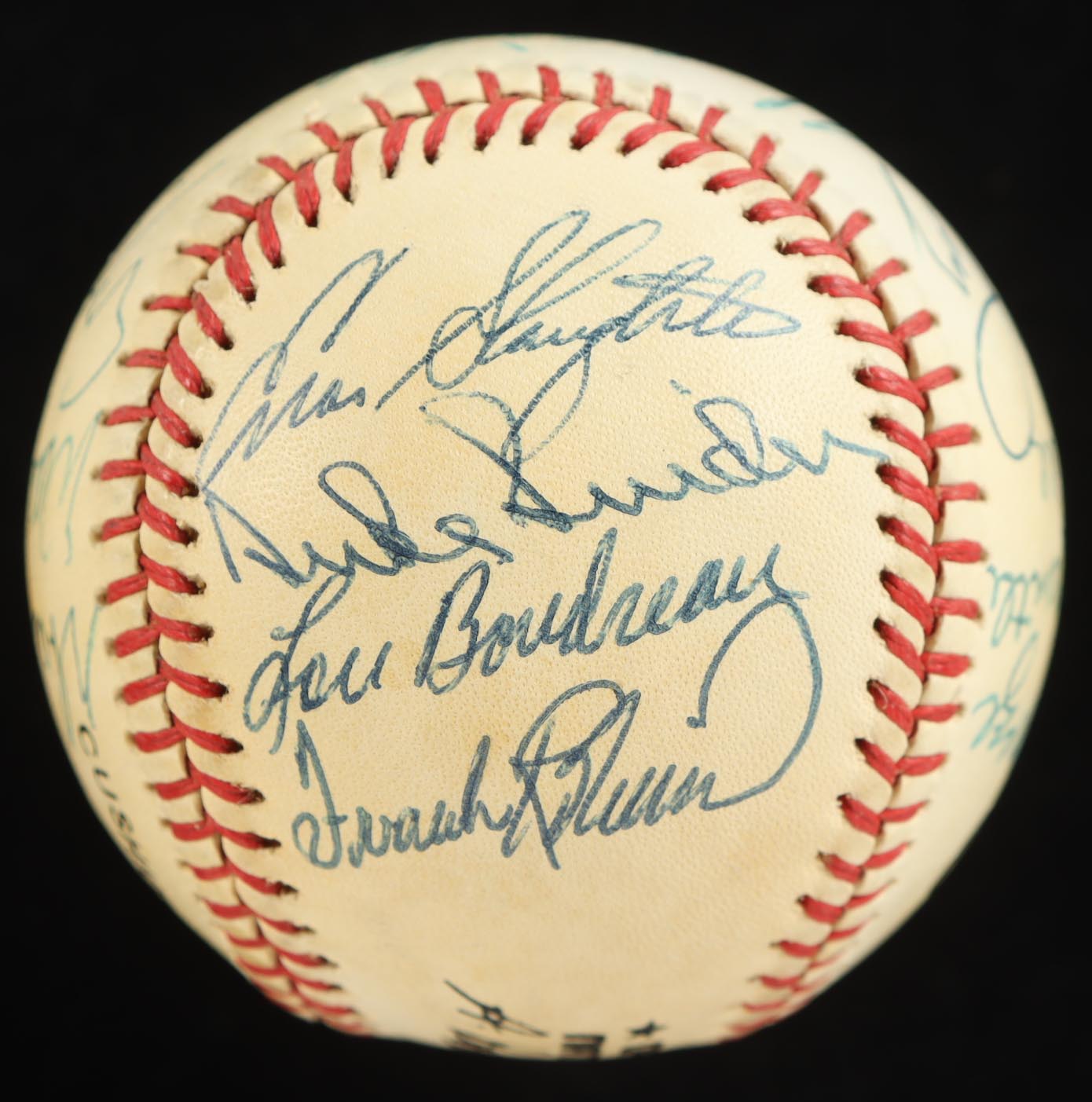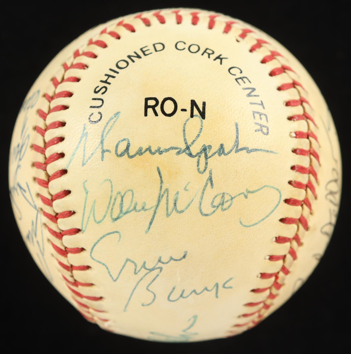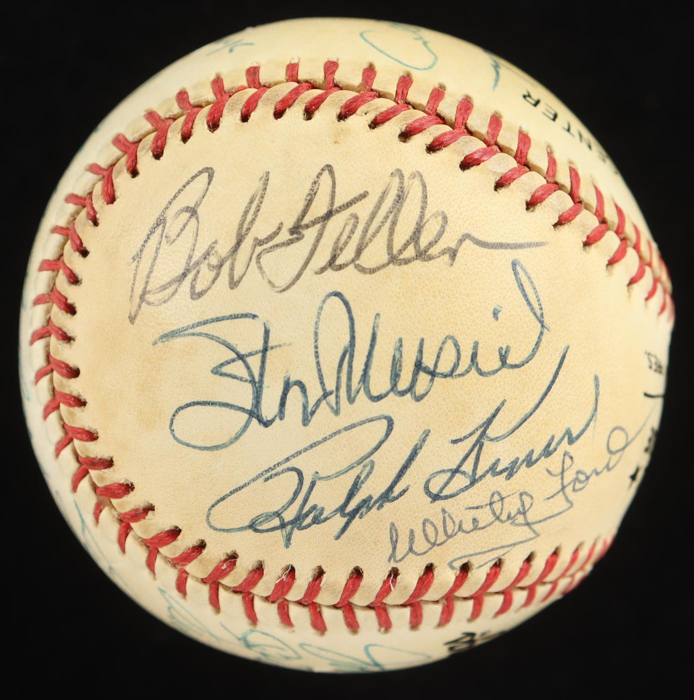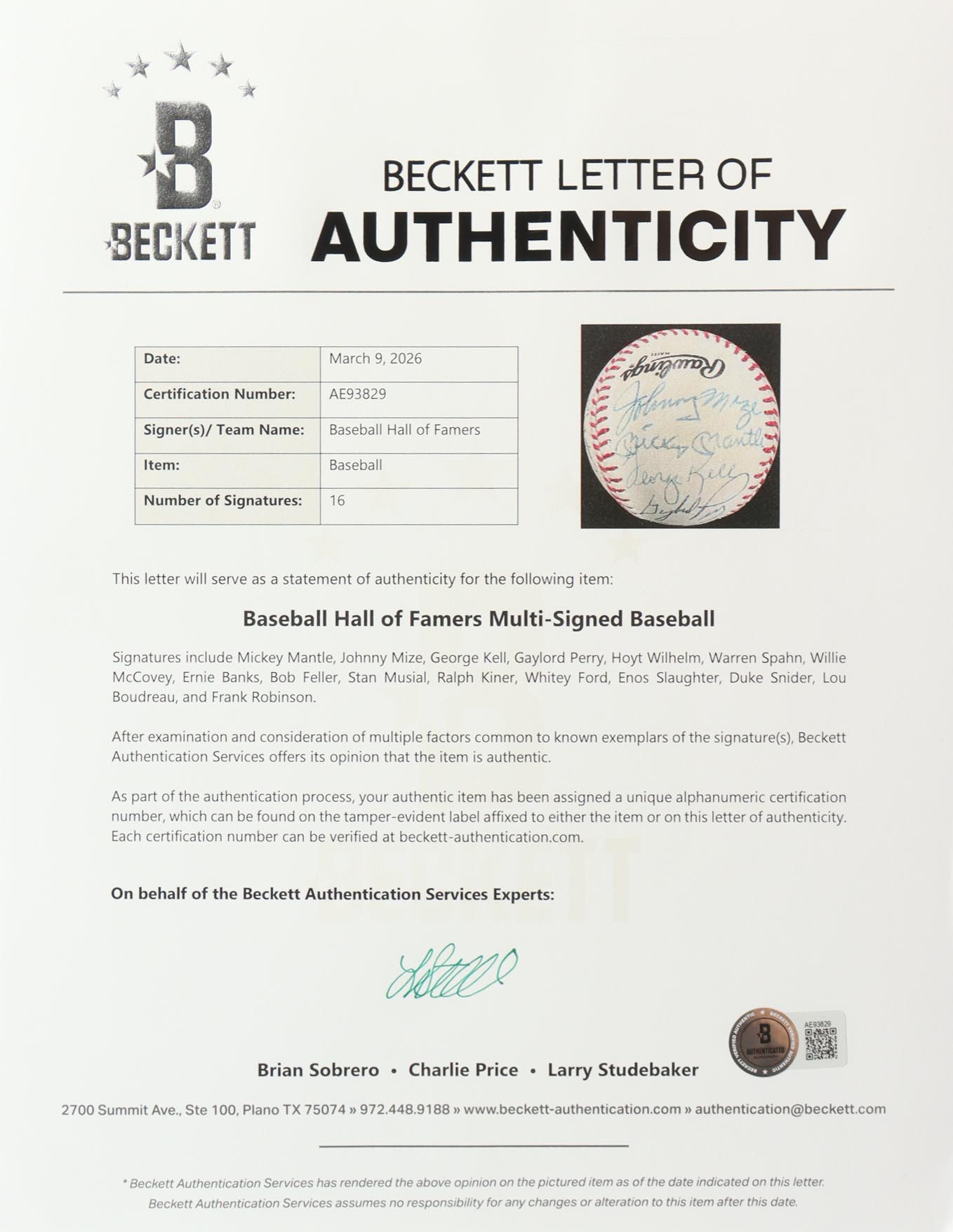 Rawlings Official National League baseball has been hand-signed by (16) hall-of-famers with Mickey Mantle, Johnny Mize, George Kell, Gaylord Perry, Hoyt Wilhelm, Warren Spahn, Willie McCovey, Ernie Banks, Bob Feller, Stan Musial, Ralph Kiner, Whitey Ford, Enos Slaughter, Duke Snider, Lou Boudreau, and Frank Robinson.