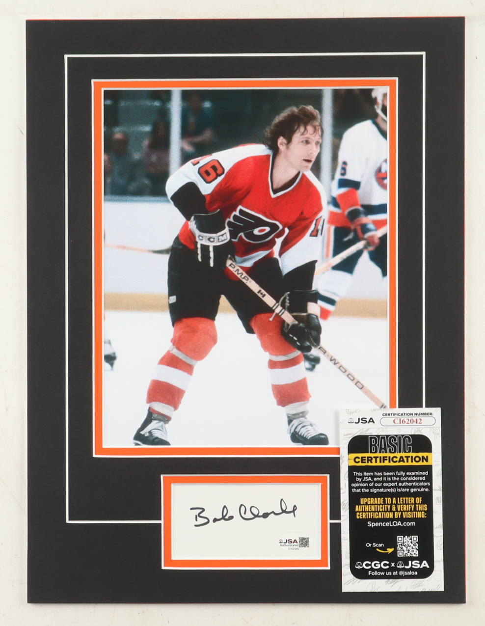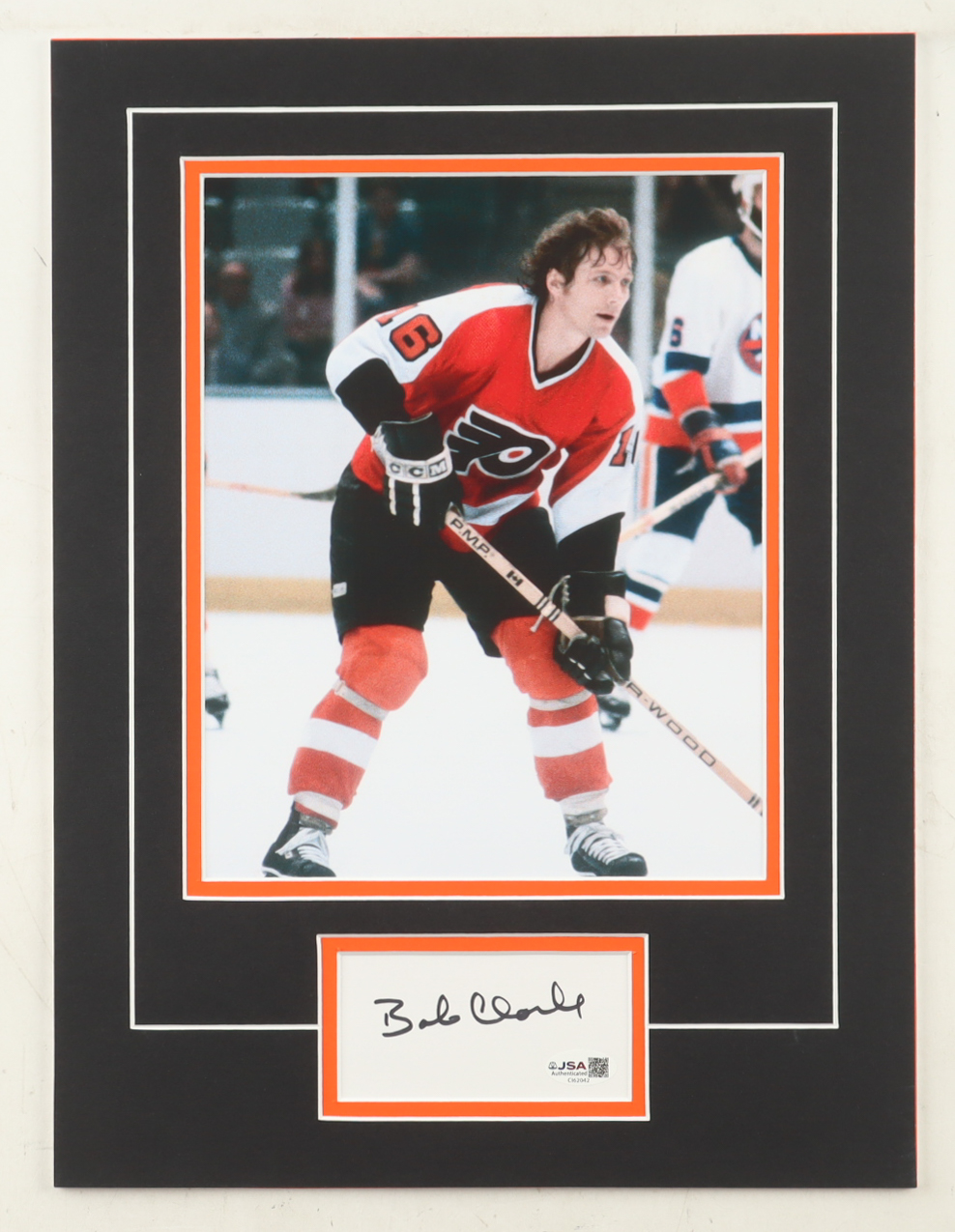 Custom display measures approximately 12" x 16" in size and features a cut that has been hand-signed by Bob Clarke (Philadelphia Flyers, HOF). The display also features a 8" x 10" photo.