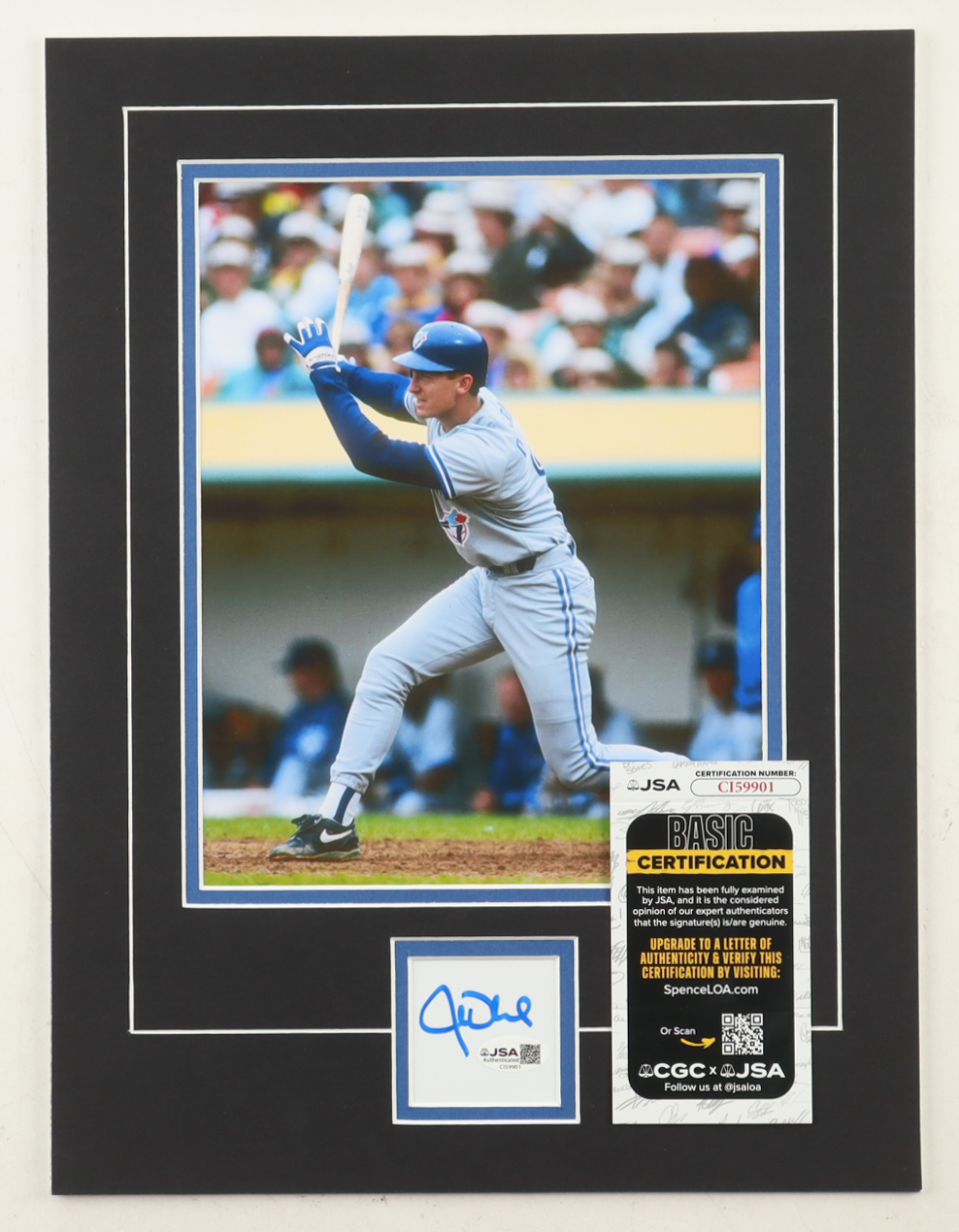 Custom display measures approximately 12" x 16" in size and features a cut that has been hand-signed by John Olerud (Toronto Blue Jays, HOF). The display also features a 8" x 10" photo.
