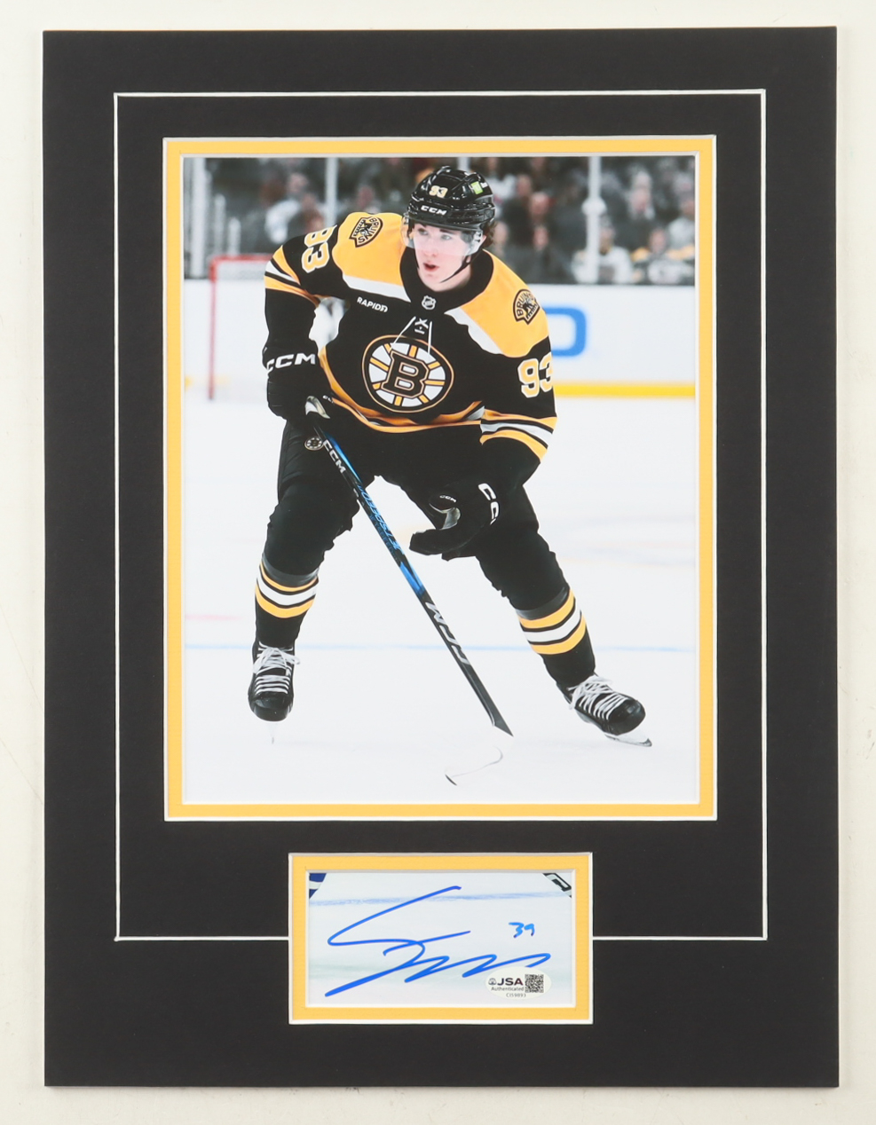 Custom display measures approximately 12" x 16" in size and features a cut that has been hand-signed by Fraser Minten (Boston Bruins). The display also features a 8" x 10" photo.