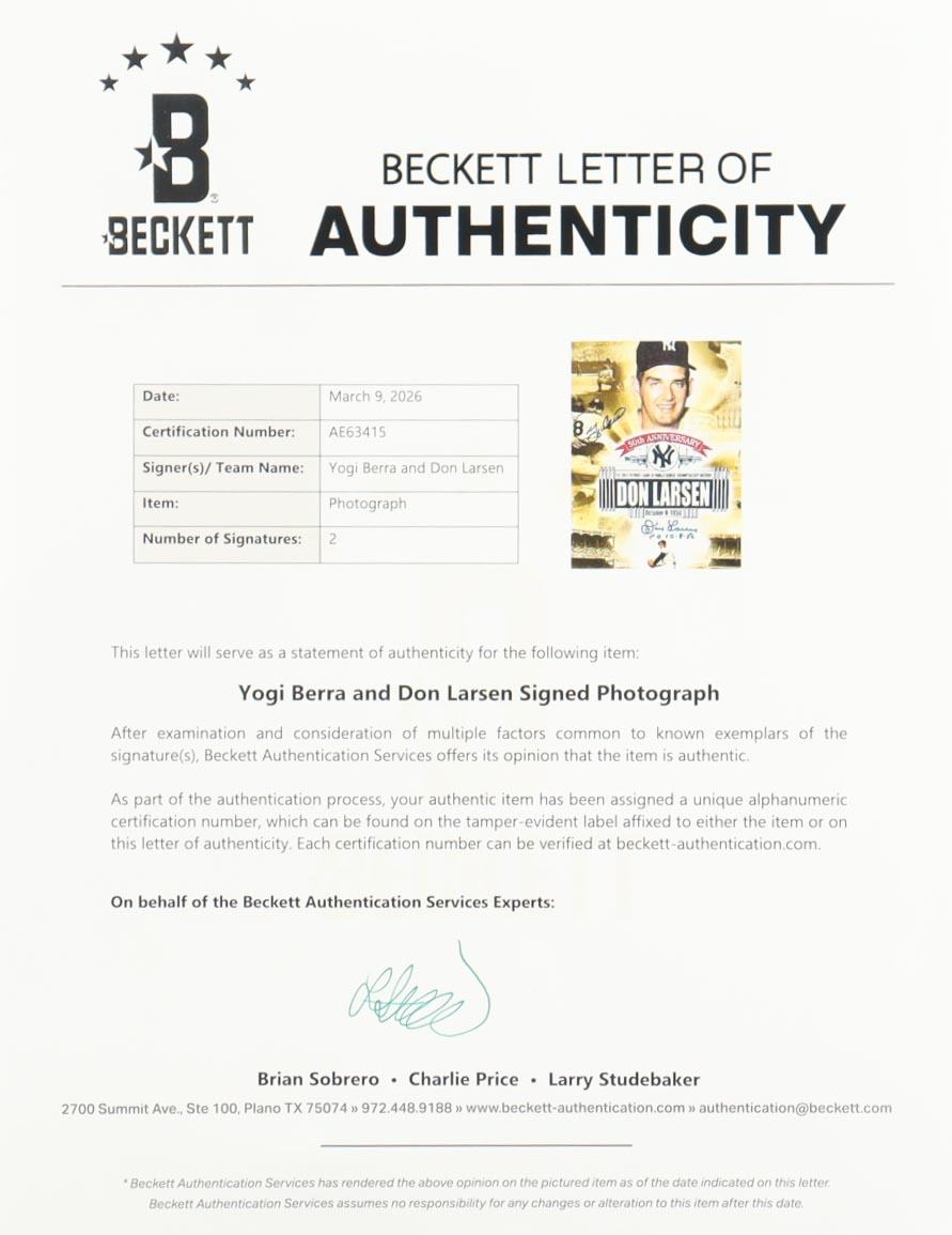 Photo measures 8” x 10” in size and has been hand-signed by Yogi Berra (D. 2015, New York Yankees, HOF) and Don Larsen (D. 2020, New York Yankees).