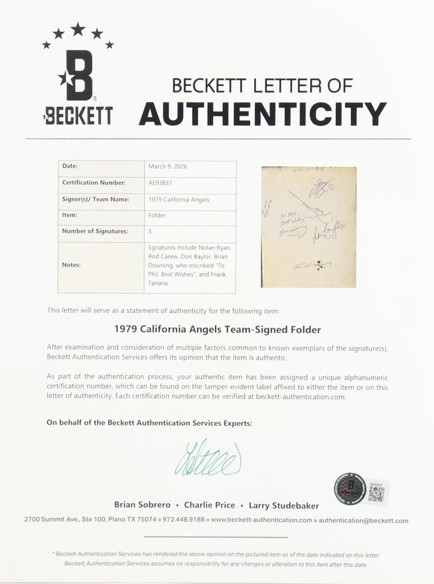 MVP Scouting Report folder has been hand-signed by Nolan Ryan, Rod Carew, Don Baylor, Brian Downing, and Frank Tanana (California Angels). Please note, there is corner wear and creasing on the folder.
