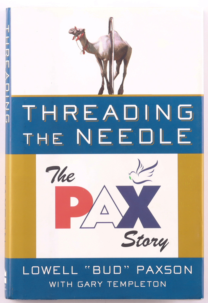 "Threading the Needle: The Pax Net Story" Hardcover Book has been hand-signed and inscribed on inside page by Bud Paxson (D. 2015). Please note, the inscription has been personalized "To Nancy Goldman".