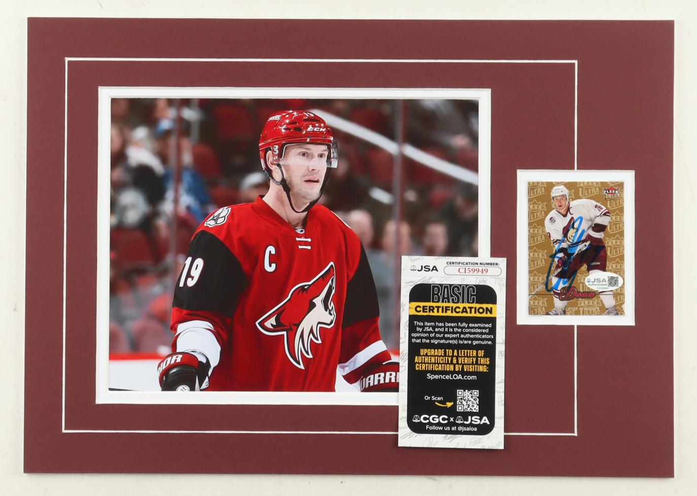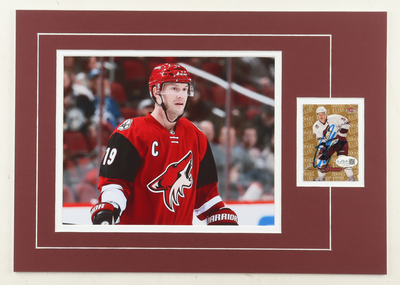 Custom display measures approximately 12" x 16" in size and features a trading card that has been hand-signed by Shane Doan (Arizona Coyotes). The display also features a 8" x 10" photo.