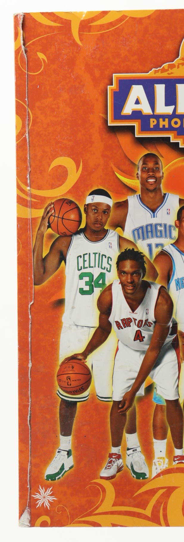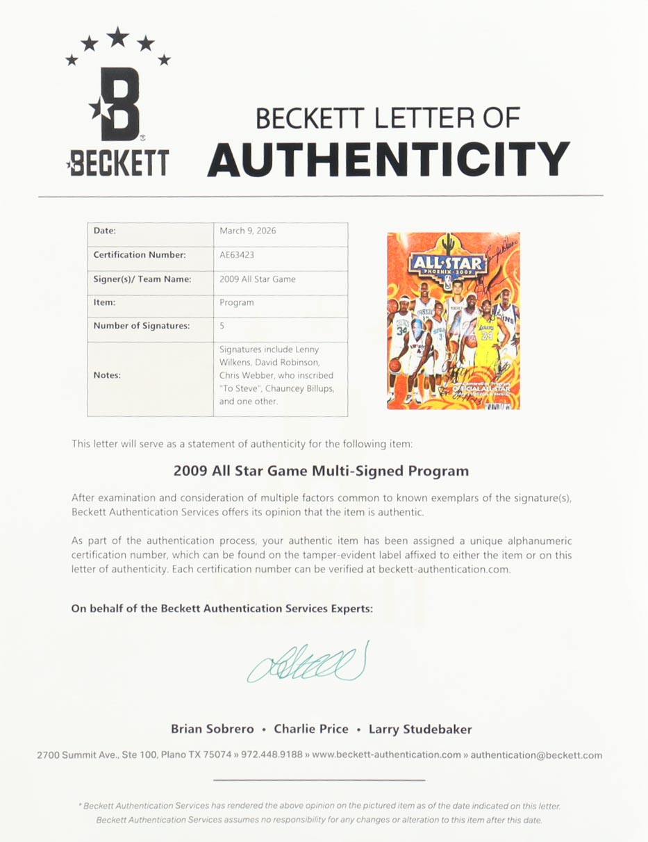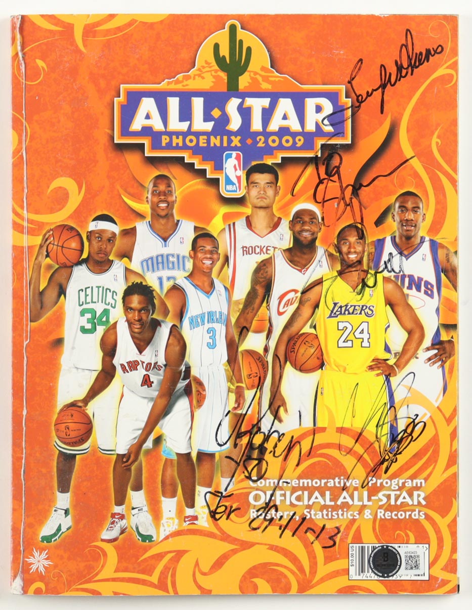 2009 NBA All-Star Game commemorative program magazine has been hand-signed on the front cover by Lenny Wilkens, David Robinson, Chris Webber, Chauncey Billups, and one other. Please note the cover is damaged, see photos for more details.