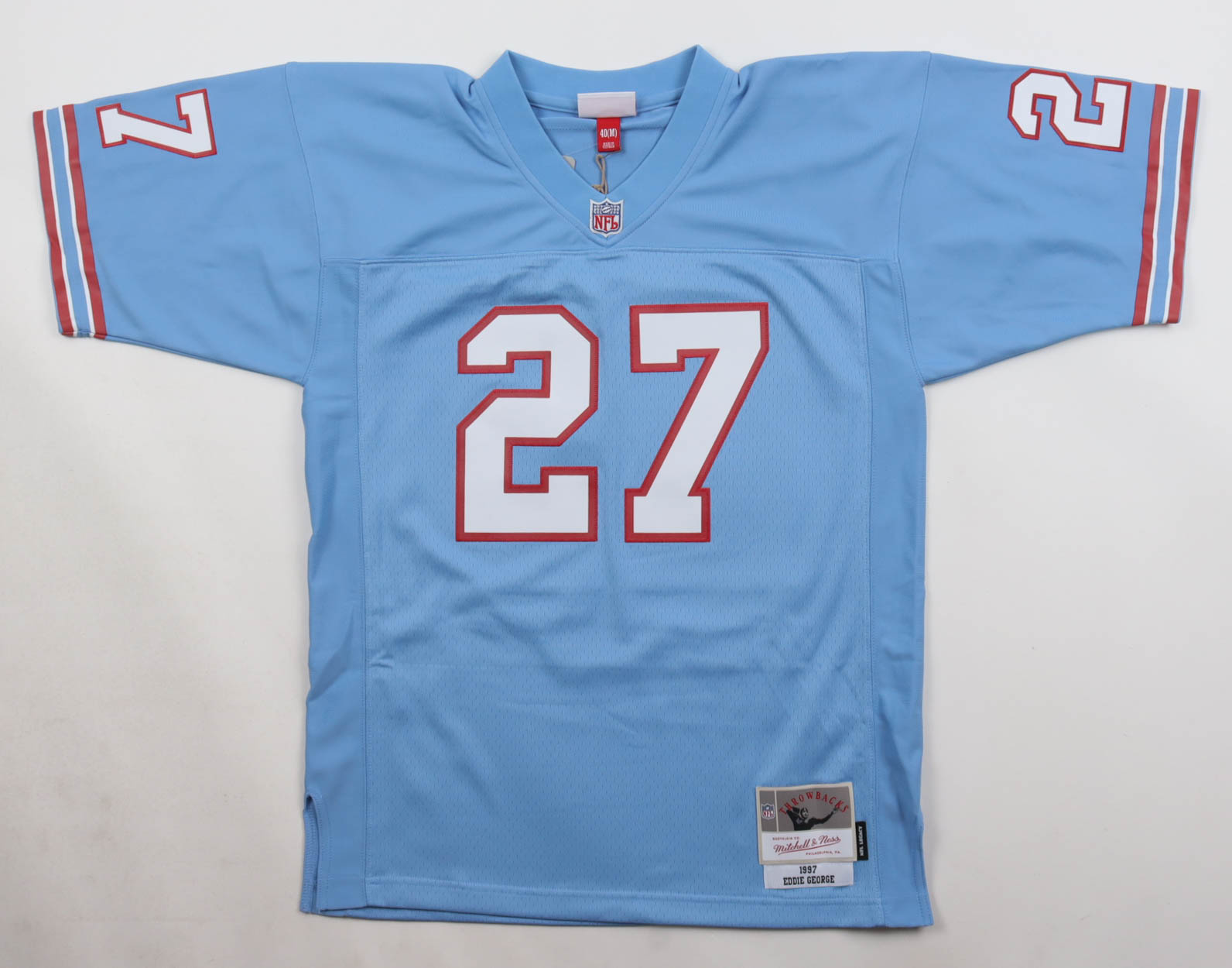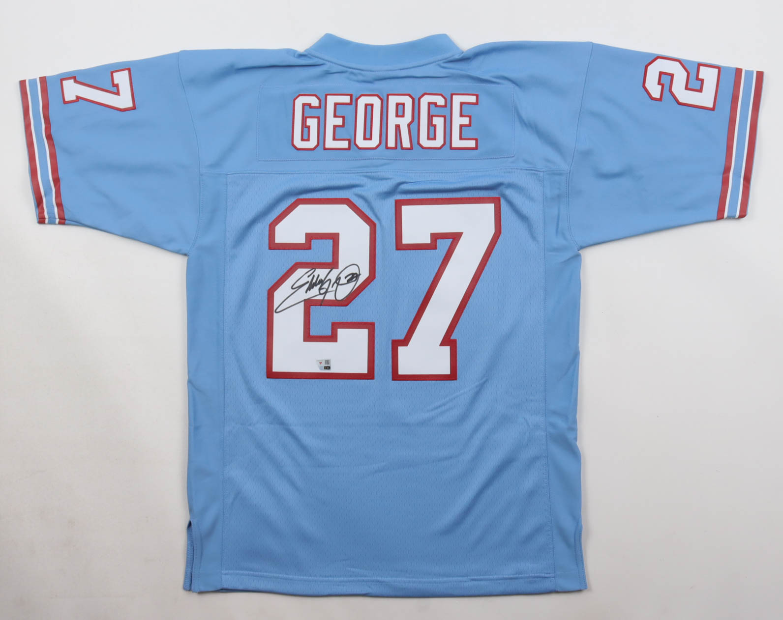 1997 Mitchell & Ness jersey with everything sewn on, size 40 (M). Hand-signed by Eddie George (Houston Oilers).