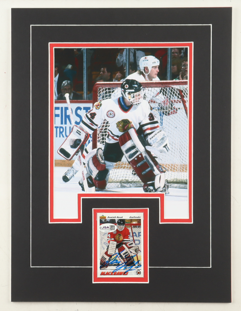 Custom display measures approximately 12" x 16" in size and features a trading card that has been hand-signed by Dominik Hasek (Chicago Blackhawks, HOF). The display also features a 8" x 10" photo.