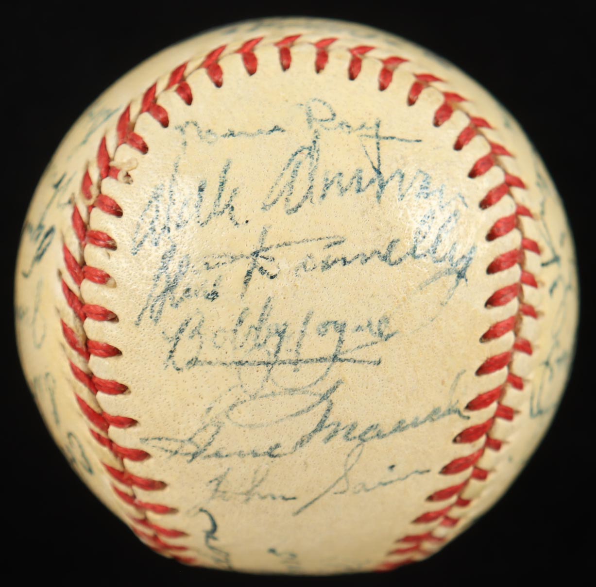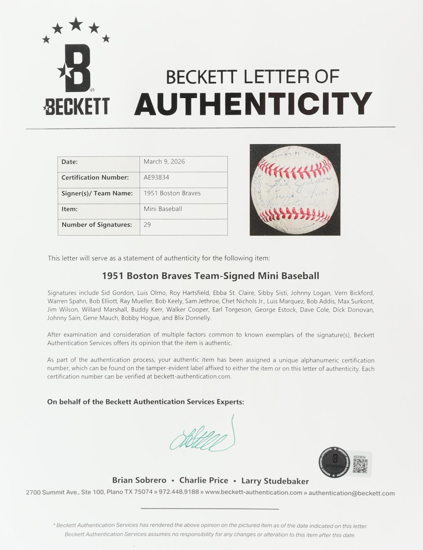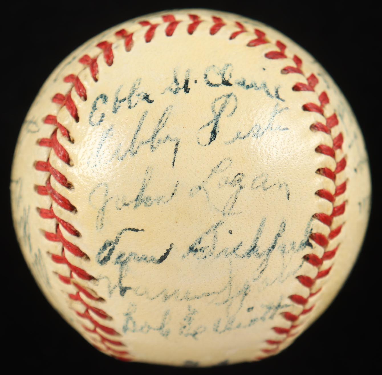 Spalding Official National League mini baseball. Hand-signed by (29) members of the 1951 Boston Braves with Sid Gordon, Luis Olmo, Roy Hartsfield, Ebba St. Claire, Sibby Sisti, Johnny Logan, Vern Bickford, Warren Spahn, Bob Elliott, Ray Mueller, Bob Keely, Sam Jethroe, Chet Nichols Jr., Luis Marquez, Bob Addis, Max Surkont, Jim Wilson, Willard Marshall, Buddy Kerr, Walker Cooper, Earl Torgeson, George Estock, Dave Cole, Dick Donovan, Johnny Sain, Gene Mauch, Bobby Hogue, and Blix Donnelly. Please note, the ball is naturally toned, and the display stand is included as shown.