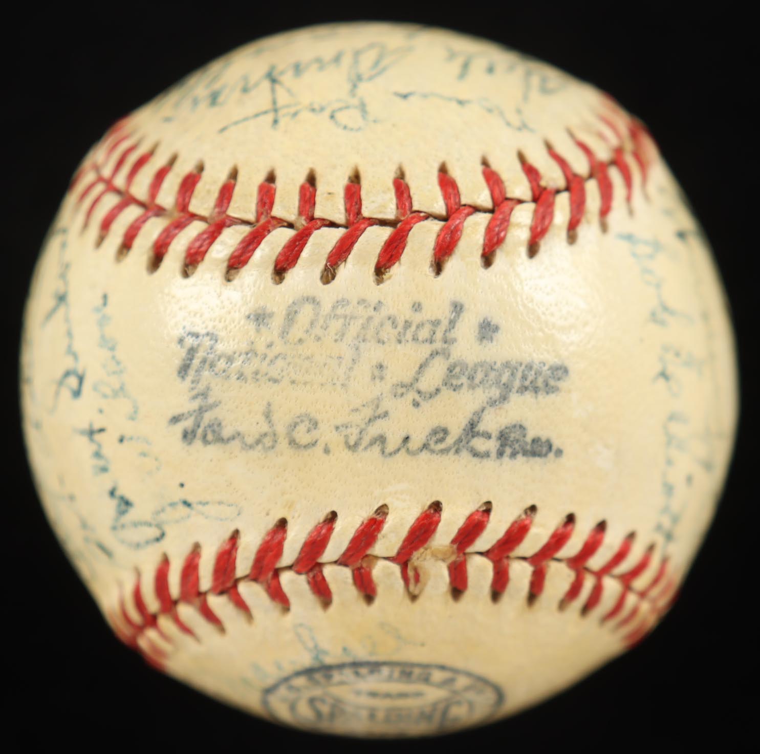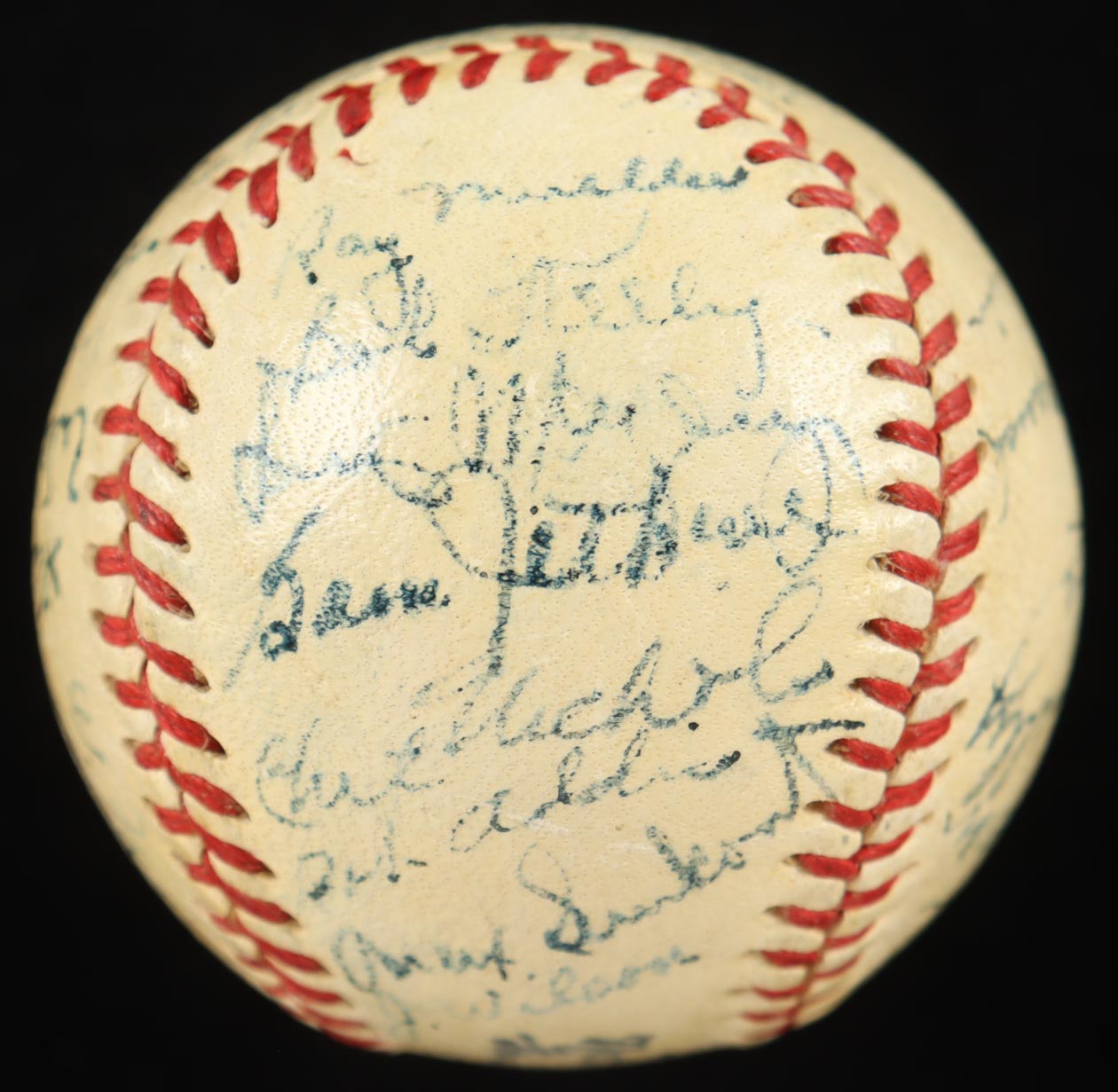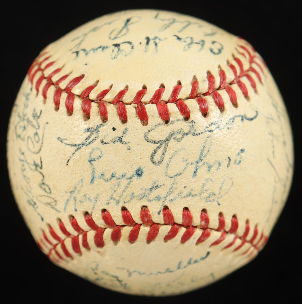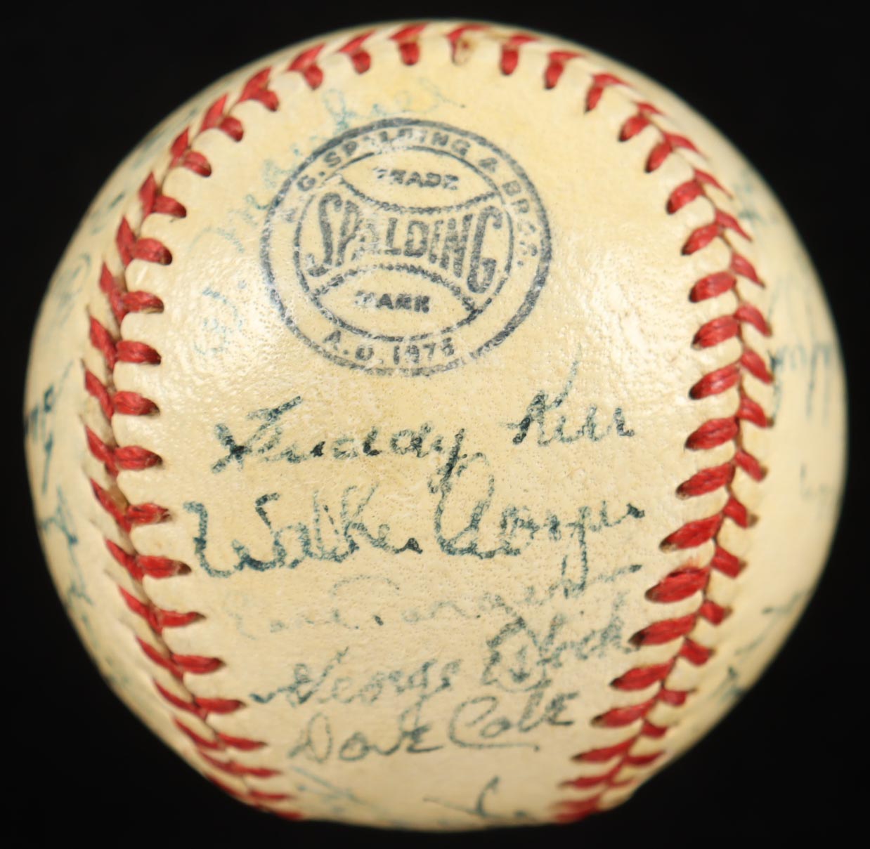 Spalding Official National League mini baseball. Hand-signed by (29) members of the 1951 Boston Braves with Sid Gordon, Luis Olmo, Roy Hartsfield, Ebba St. Claire, Sibby Sisti, Johnny Logan, Vern Bickford, Warren Spahn, Bob Elliott, Ray Mueller, Bob Keely, Sam Jethroe, Chet Nichols Jr., Luis Marquez, Bob Addis, Max Surkont, Jim Wilson, Willard Marshall, Buddy Kerr, Walker Cooper, Earl Torgeson, George Estock, Dave Cole, Dick Donovan, Johnny Sain, Gene Mauch, Bobby Hogue, and Blix Donnelly. Please note, the ball is naturally toned, and the display stand is included as shown.