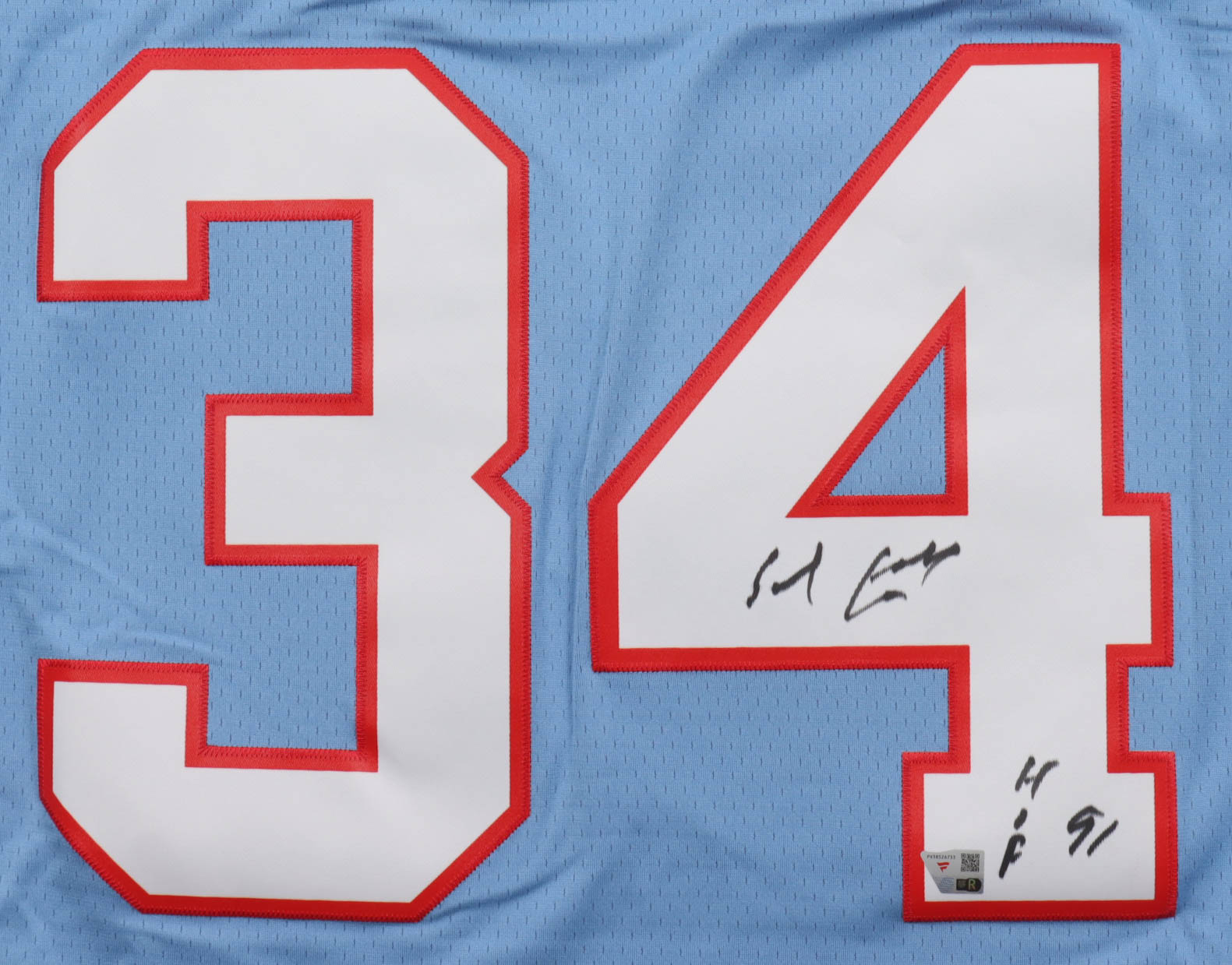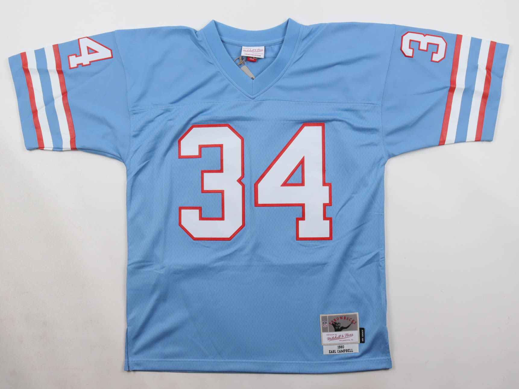 Mitchell & Ness jersey with everything pressed on, size 44 (L). Hand-signed and inscribed by Earl Campbell (Houston Oilers, HOF).
