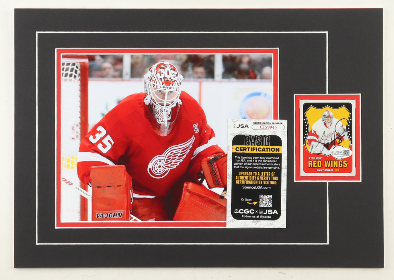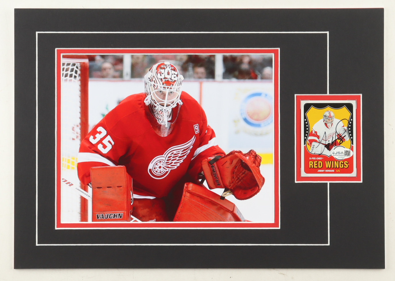 Custom display measures approximately 12" x 17" in size and features a trading card that has been hand-signed by Jimmy Howard (Detroit Red Wings). The display also features a 8" x 10" photo.