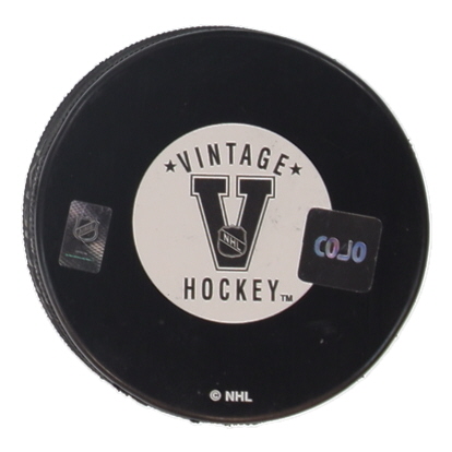 Quebec Nordiques logo hockey puck. Hand-signed and inscribed by Michel Goulet (HOF).