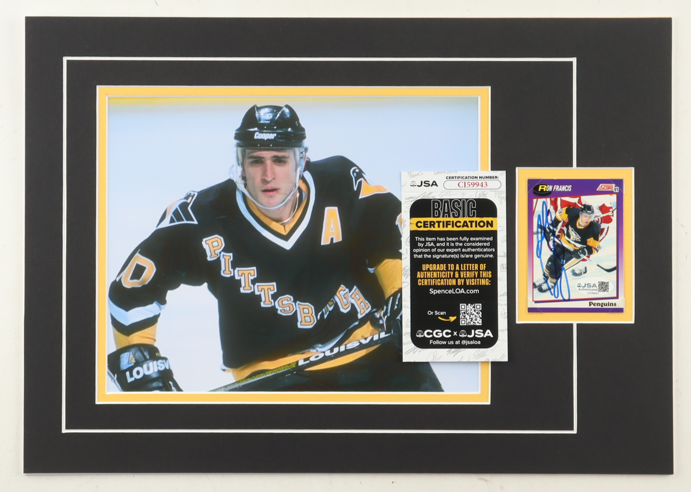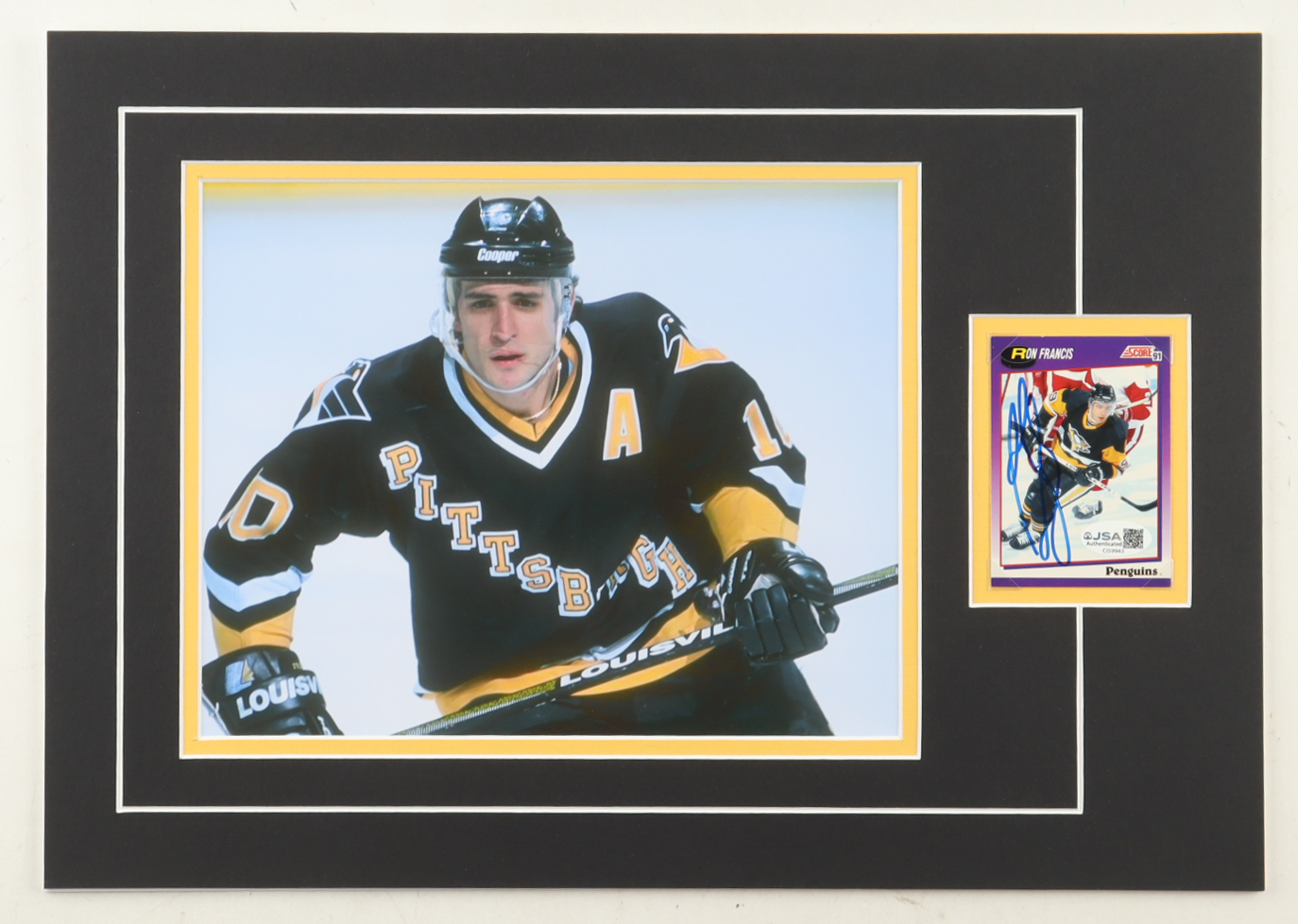 Custom display measures approximately 12" x 17" in size and features a trading card that has been hand-signed by Ron Francis (Pittsburgh Penguins, HOF). The display also features a 8" x 10" photo.