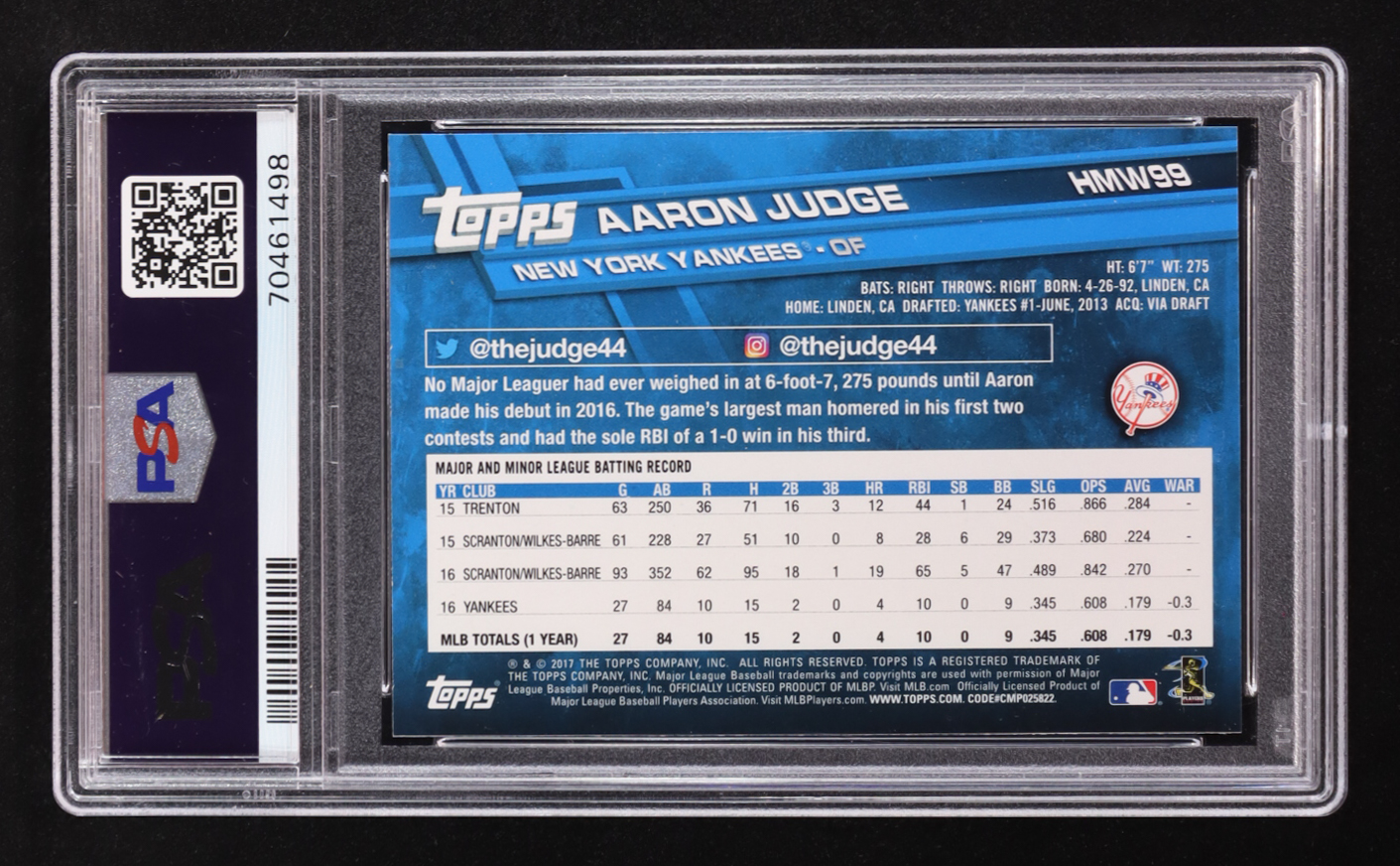 Aaron Judge 2017 Topps Walmart Holiday Snowflake #HMW99 RC (PSA 9)