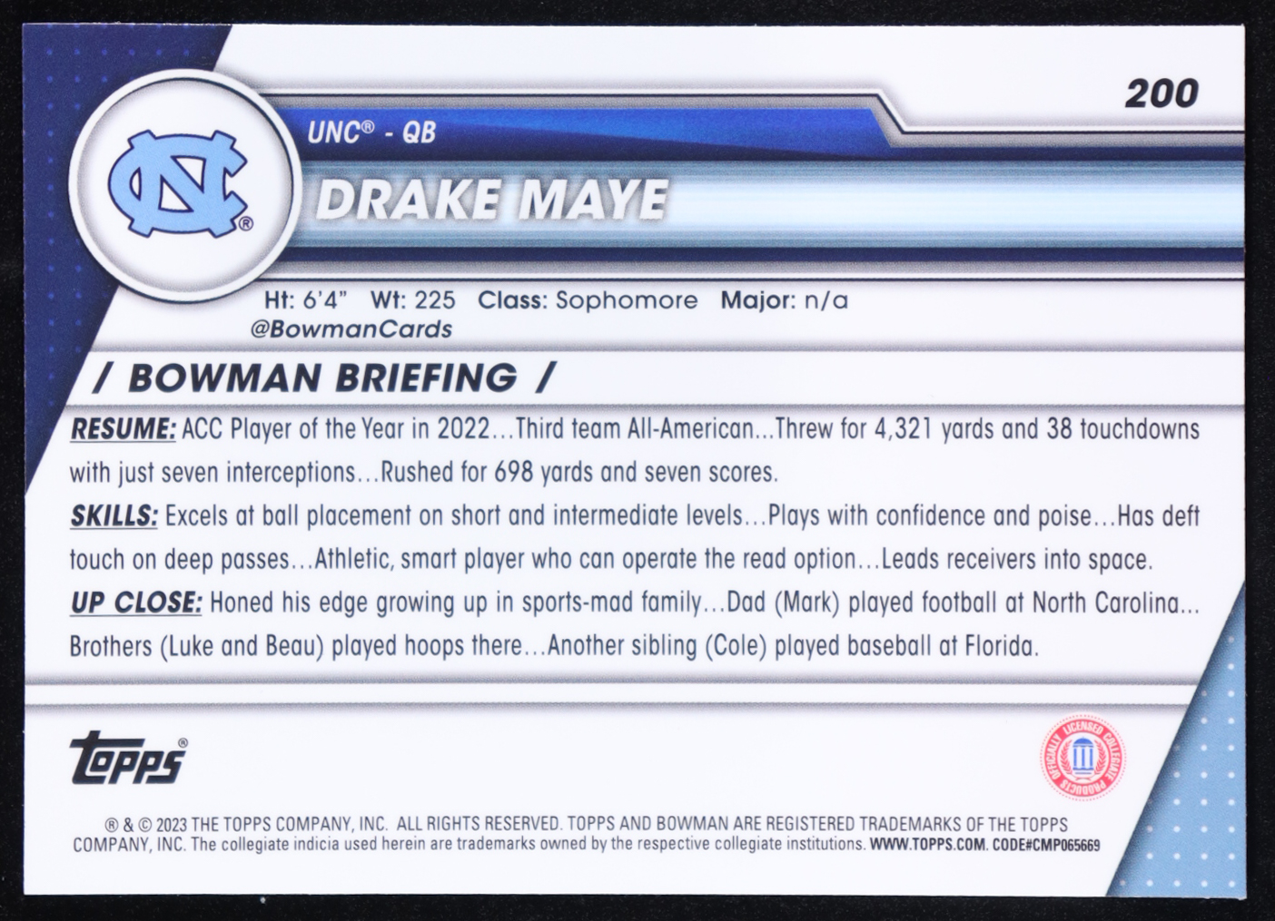 Drake Maye 2023 Bowman Chrome University #200 RC